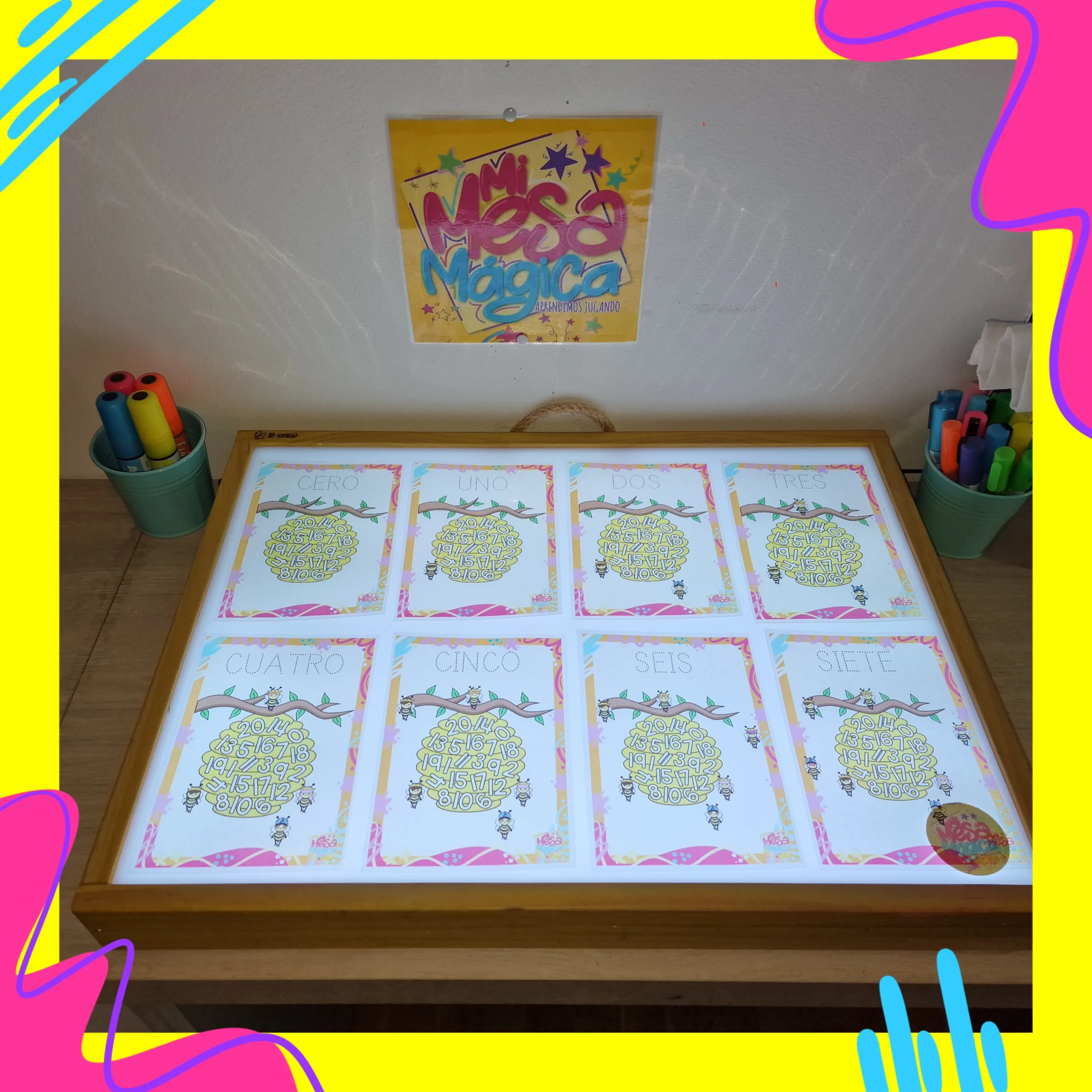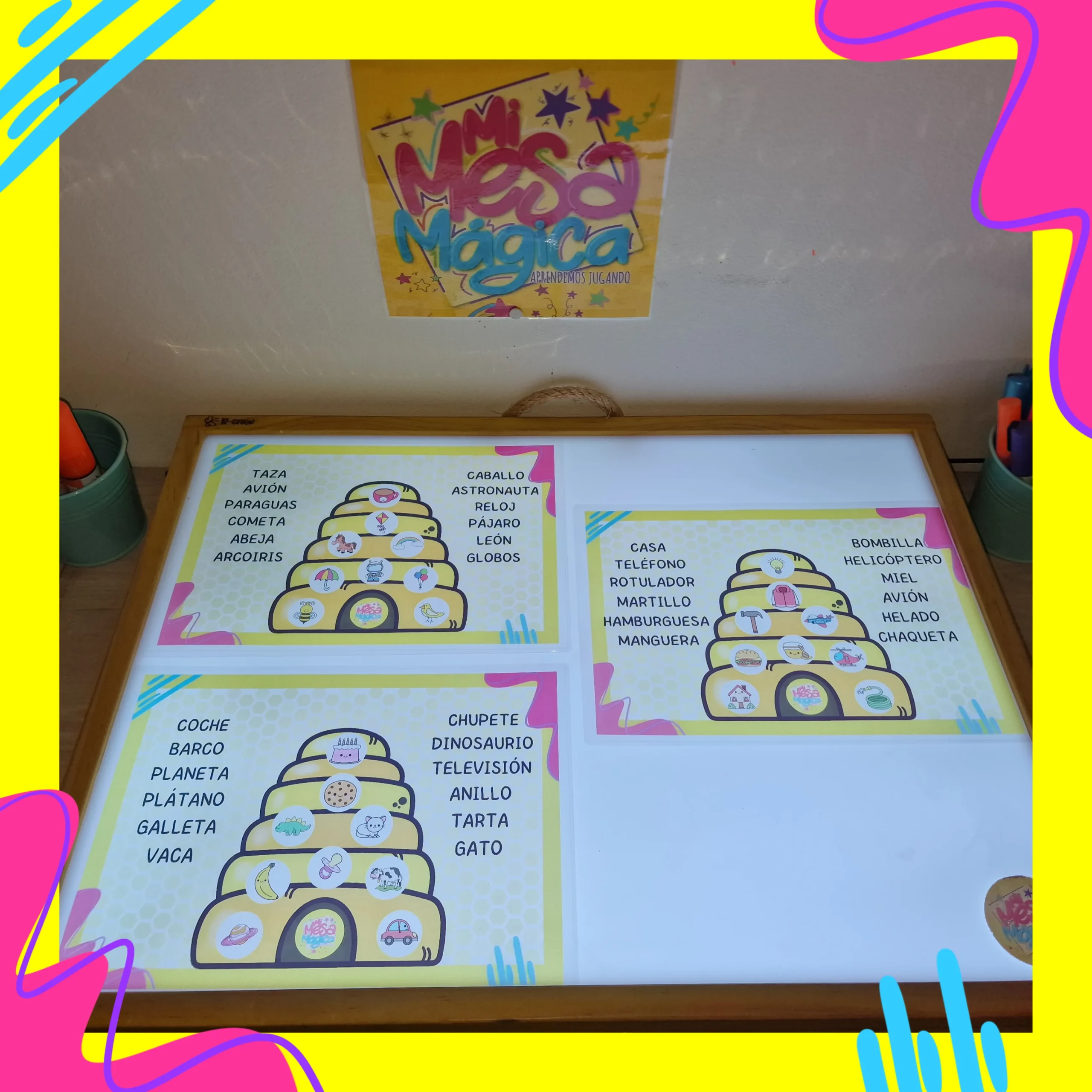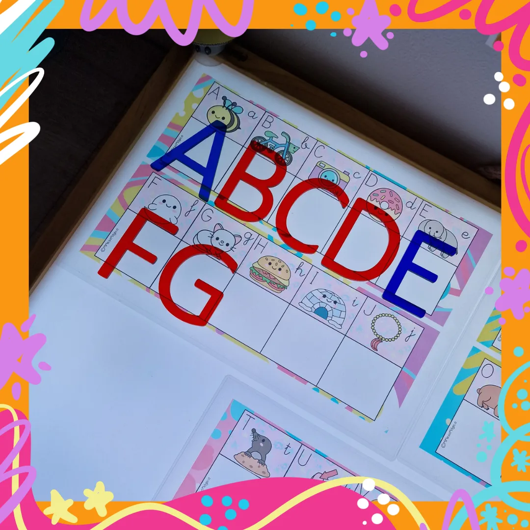 Abecedario completo de láminas de acetato plastificado para rellenar con letras translúcidas o escribir con rotuladores borrables.