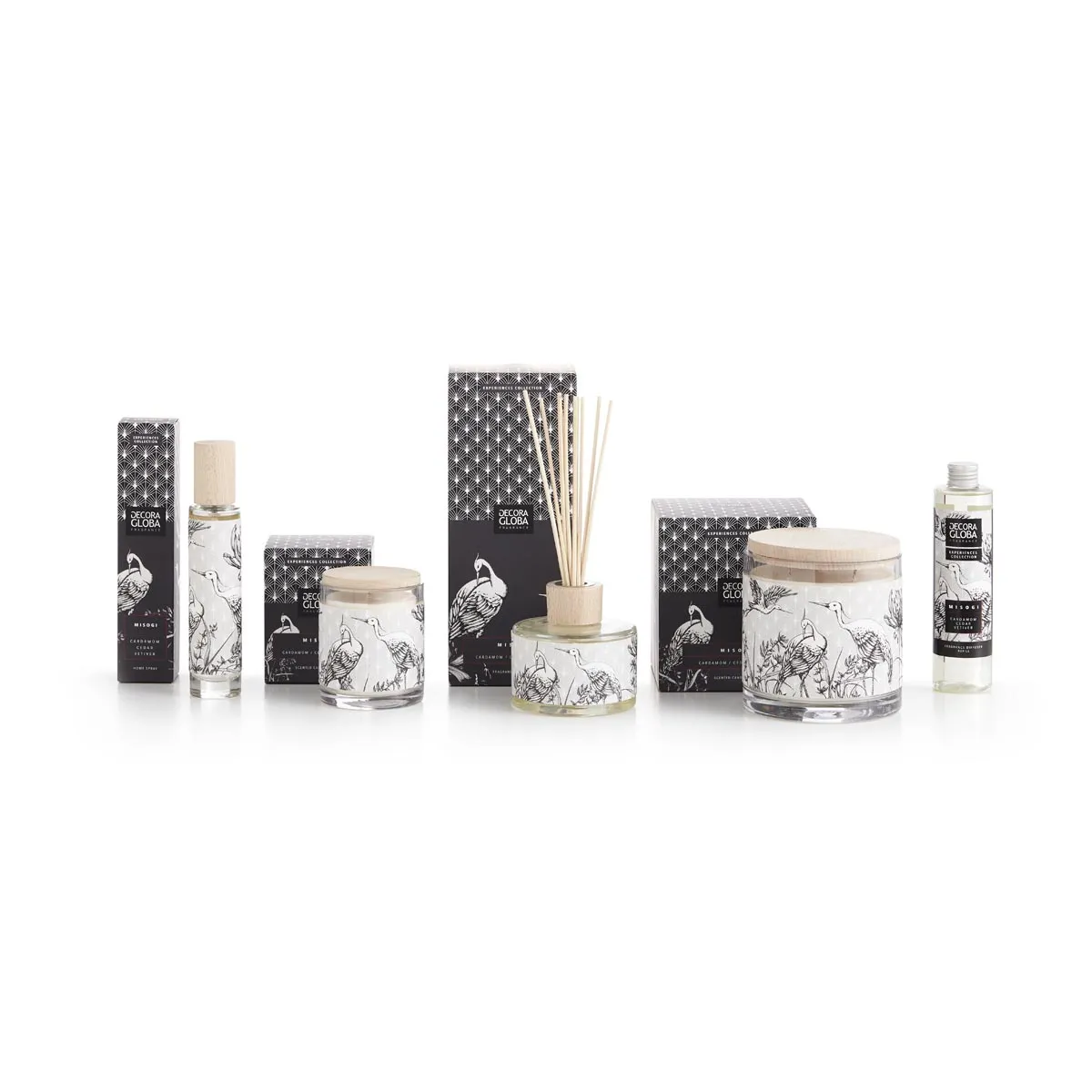 Fragancia en spray presentada en recipiente de cristal 100% reciclable con tapa de madera y etiqueta decorativa de tela ilustrada por el artista Raúl del Sol.