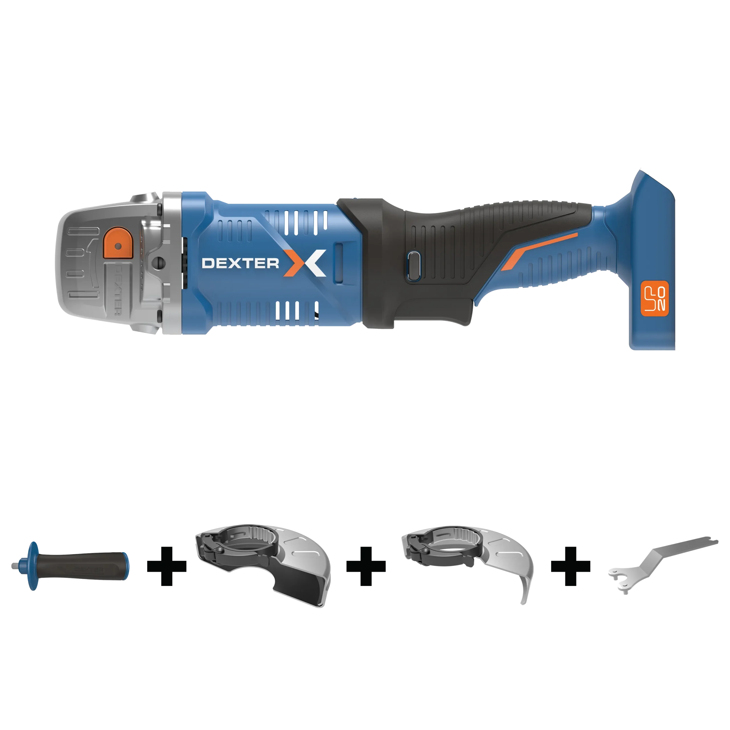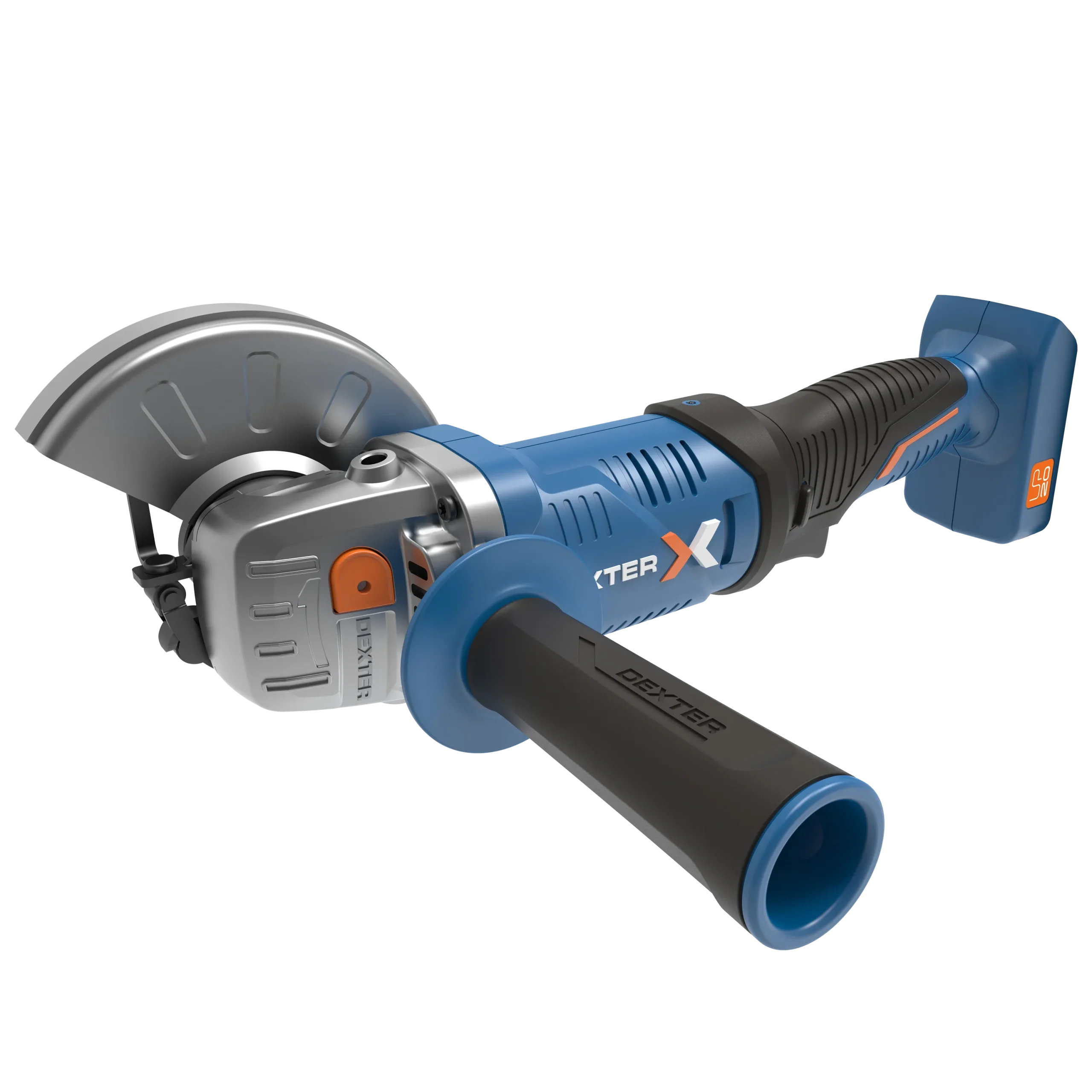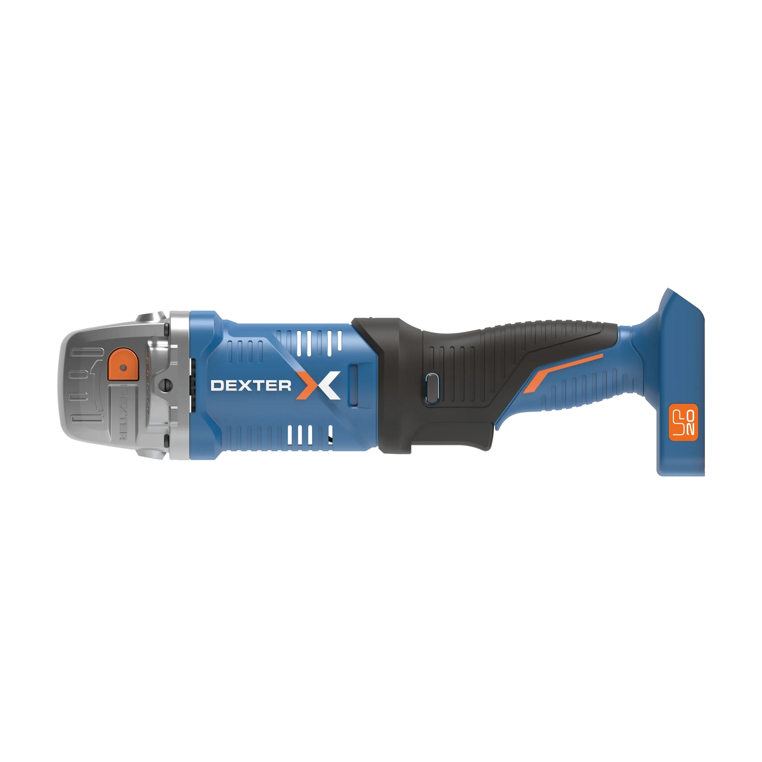 Amoladora sin cable Dexter de 20 V, de uso regular, con batería de ion-litio (batería no incluida) con un motor con escobilla de carbón, que alcanza una velocidad media de acción de 9.000 rpm. Diámetro de disco de 125 mm y diámetro del agujero de disco de 22,30 mm. Dispone de fijación rápida de carter. Cuenta con un sistema de arranque progresivo. Cuenta con una garantía de 3 años. Medidas: 9,8 x 9,7 x 33,4 cm (ancho x alto x fondo).