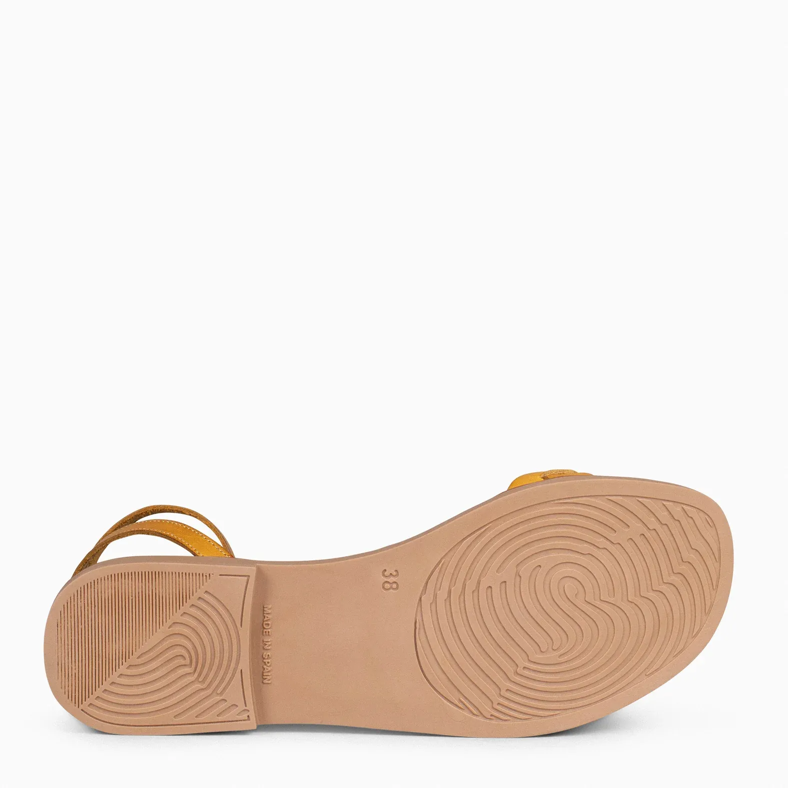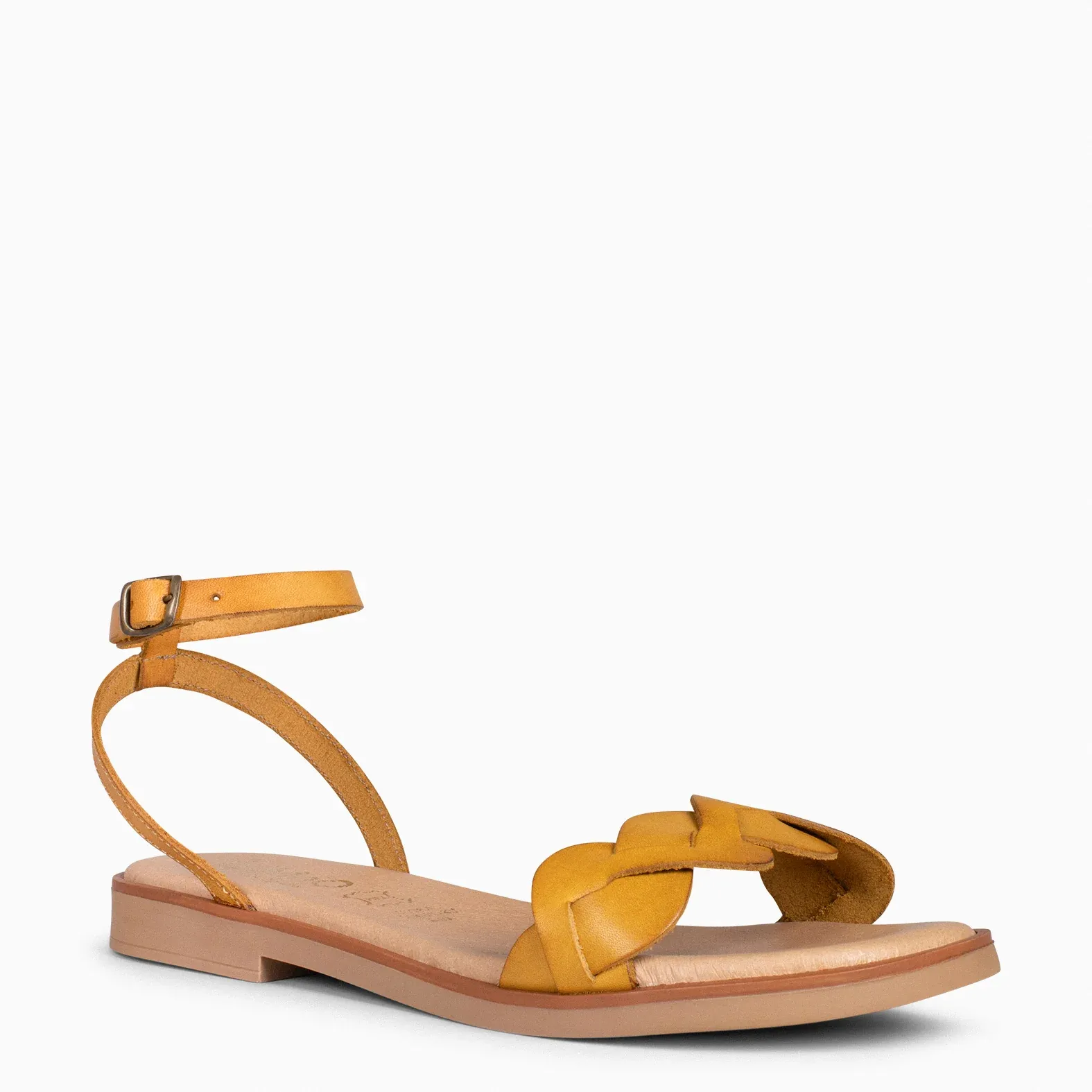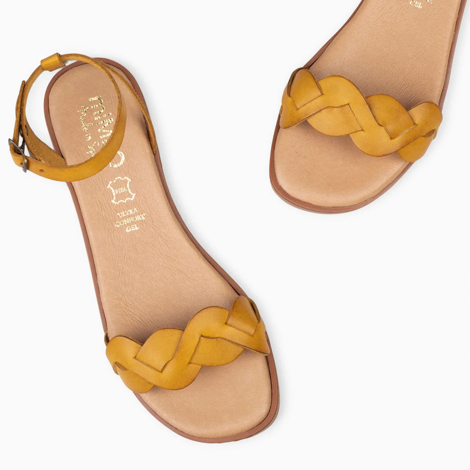Sandalias fabricadas en piel. Destaca su pala delantera con un trenzado de las tiras, que cubren el pie, dando un toque muy fresco a este calzado veraniego.