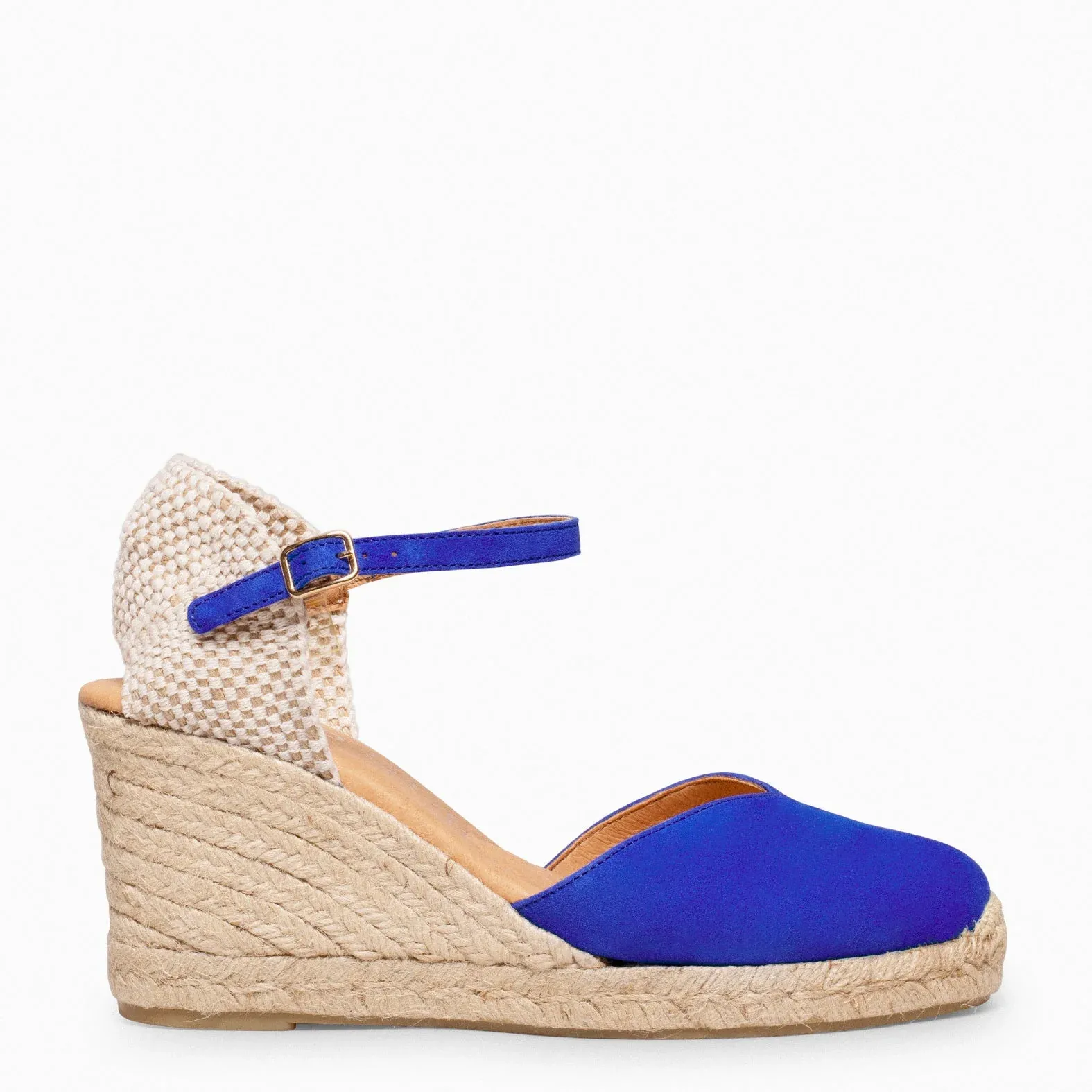 Estas cuñas de esparto están fabricadas en piel de serraje, la punta circular, una característica distintiva del diseño Peep Toe. Cuenta con una cuña de 7,5 cm y una plataforma de 2 cm, estas sandalias de esparto ofrecen una altura ideal que estiliza tu figura, permitiéndote disfrutar de la comodidad de una suela estable en cada paso.