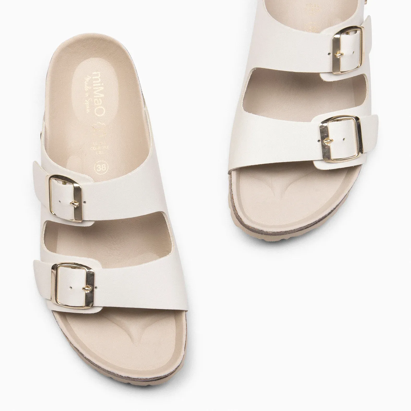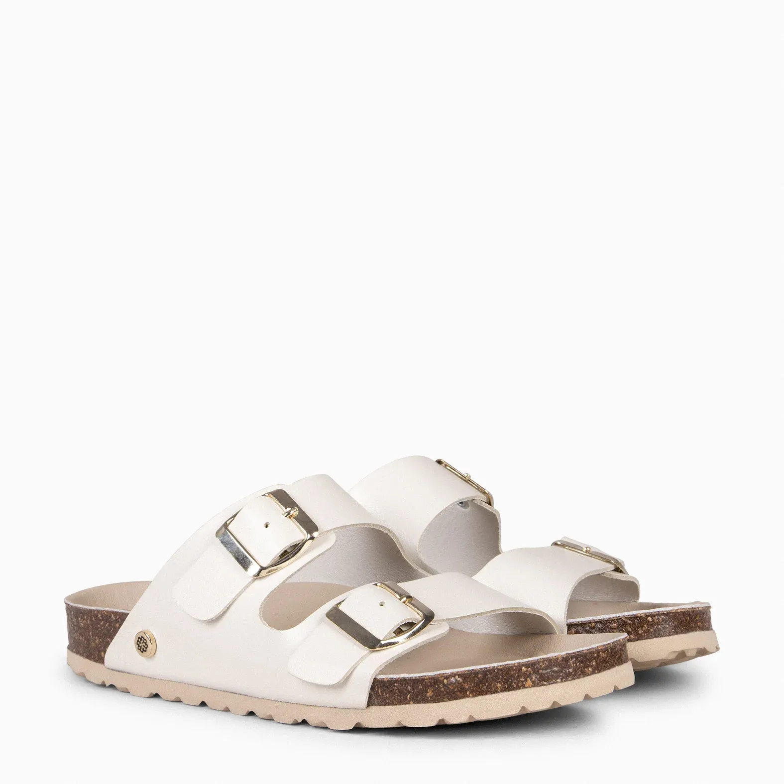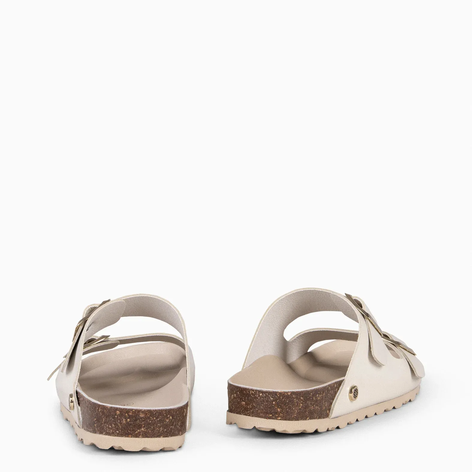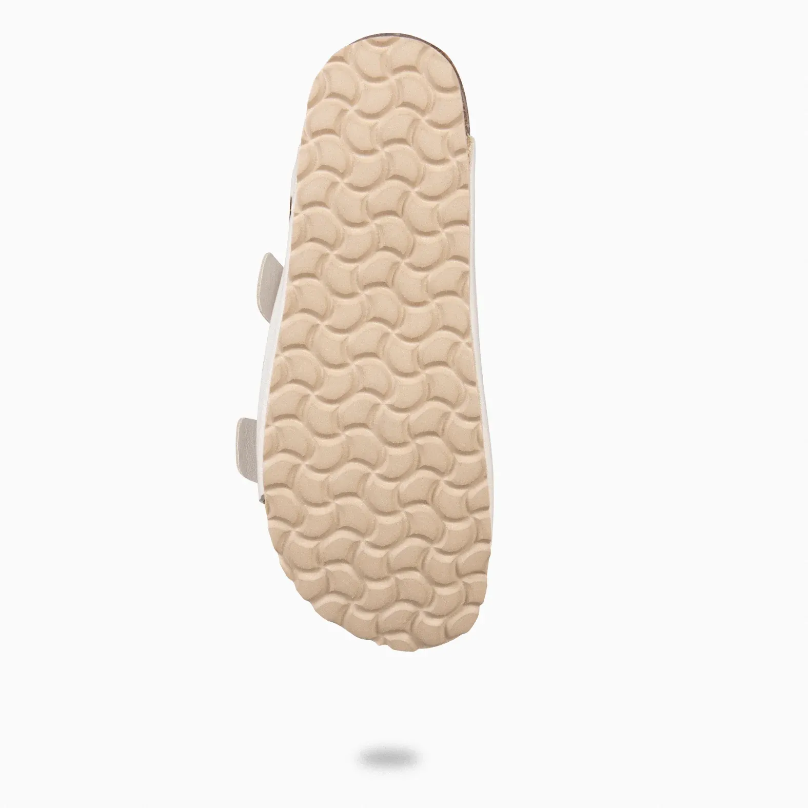 Estas sandalias de piel para mujer son perfectas y tienen una altura de cuña de 3 cm y una plataforma de 2 cm, proporcionando un equilibrio ideal entre estilo y comodidad. Su suela ecológica está elaborada con corcho reciclado y prensado, ofreciendo un calzado sostenible y respetuoso con el medio ambiente. Poseen un doble cierre ajustable mediante elegantes hebillas doradas ubicadas en el lateral externo de la pala, agregando un toque de estilo y funcionalidad.