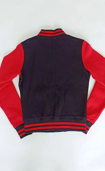 La chaqueta de estilo beisbolera es de color negra y cuenta con mangas rojas, lo que le da un contraste llamativo y deportivo. En la parte delantera de la prenda, se puede ver un logo impreso en vinilo rojo, con la letra «B», inicial de nuestra marca.