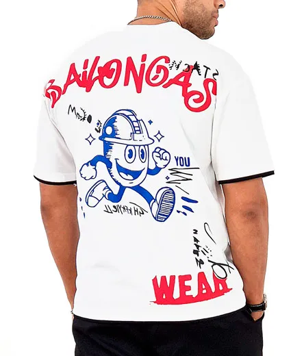 En la parte frontal, el logo de un monigote sonriente añade un toque divertido y juvenil, mientras que en la espalda, un logo a gran escala ocupa todo el área, acompañado de letras de estilo desgastado, que refuerzan la esencia vintage y original de la prenda. Esta camiseta es ideal para quienes buscan un equilibrio entre confort y un diseño atrevido y lleno de personalidad, perfecta tanto para el día a día como para un look casual con un toque especial.