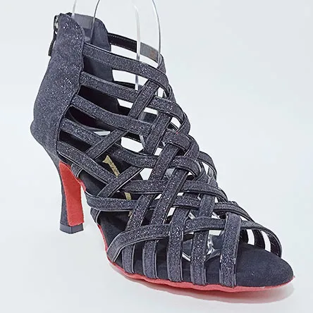 Botín de baile Lydia, de nuestra marca On1 de color negro con tiras de material brillante. Tiene forma de botín y cierre de cremallera trasero. Tacón de 8,5 cm aguja (salva 39 en adelante que lleva 7,5c,m).