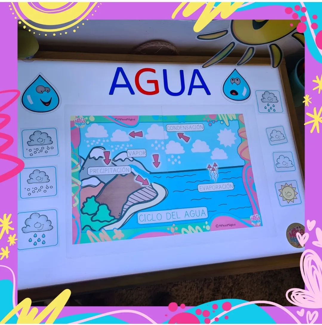 Lámina en tamaño A3 para trabajar el ciclo del agua. Contiene tarjetas para completar el ciclo.