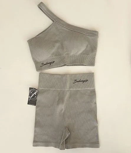 Este Conjunto Asimétrico, compuesto por un top y short es ideales para nuestro look fitness y para el día a día.  Su diseño está compuesto por un tejido canalé en  fabulosos colores a elegir entre 2 tonos diferentes: rosa claro y gris. El top lleva un único tirante que cruza desde el pecho a un hombro. Mientras que el short de cintura es de corte alto. Sin duda, un conjunto que no dejarán a nadie indiferente.