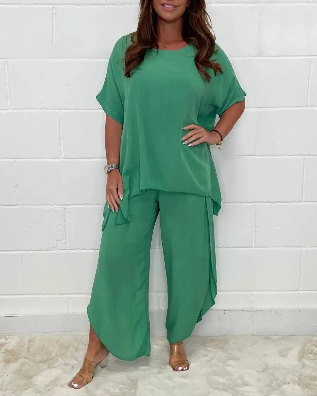 El Conjunto de dos piezas con pantalón liso de manga larga es la elección perfecta para estar cómoda y elegante en los días más cálidos. Con su diseño ligero y moderno, este conjunto es adecuado para cualquier ocasión, desde salidas informales hasta reuniones con amigos.