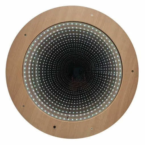 Un espejo de madera montado en la pared con una superficie de efecto infinito que brilla. Este espejo será un gran complemento para cualquier sala sensorial o zona de juegos