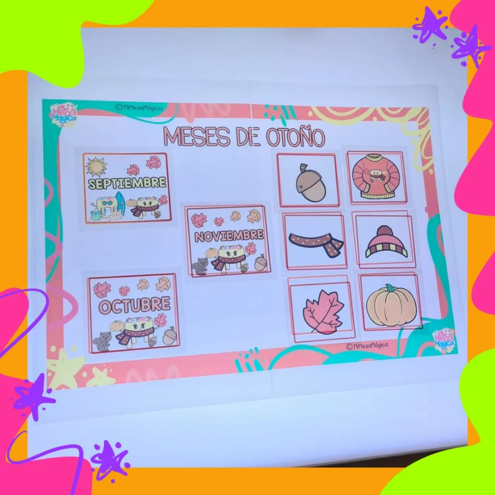 4 láminas en tamaño A3 con 12 tarjetas de las estaciones y 24 tarjetas con imágenes de cada estación, para trabajar y conocer las estaciones del año. Tanto los meses que comprenden cada estación hasta elementos característicos de cada uno de ellos.