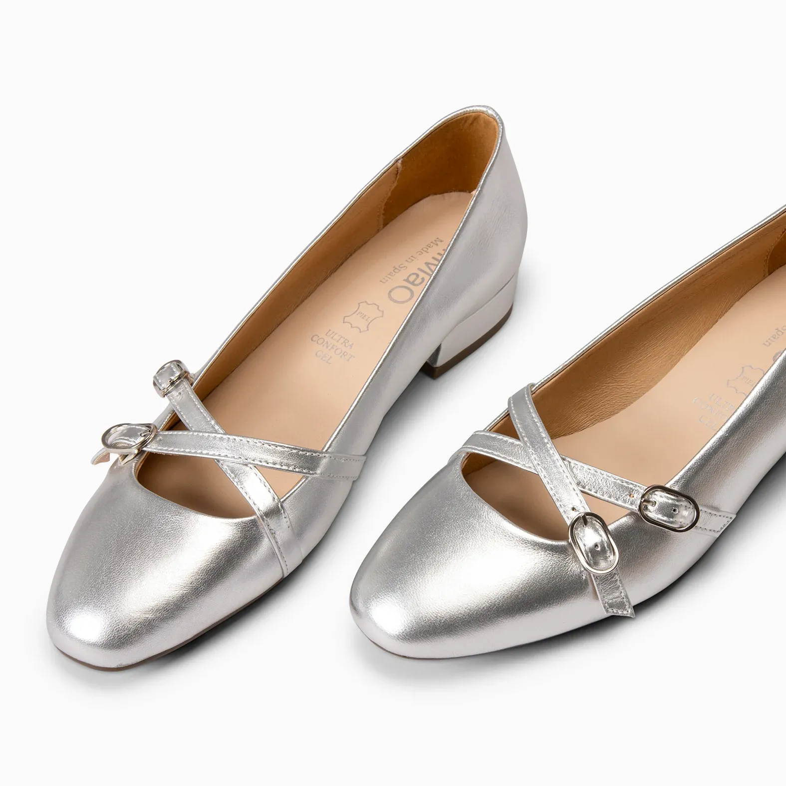 Estas Merceditas elegantes para cualquier tipo de ocasión, tienen dos hebillas ovaladas cruzadas con elástico en la zona del empeine para así darle más sujeción al pie. Tiene un tacón bajo, su material exterior es de piel de napa.