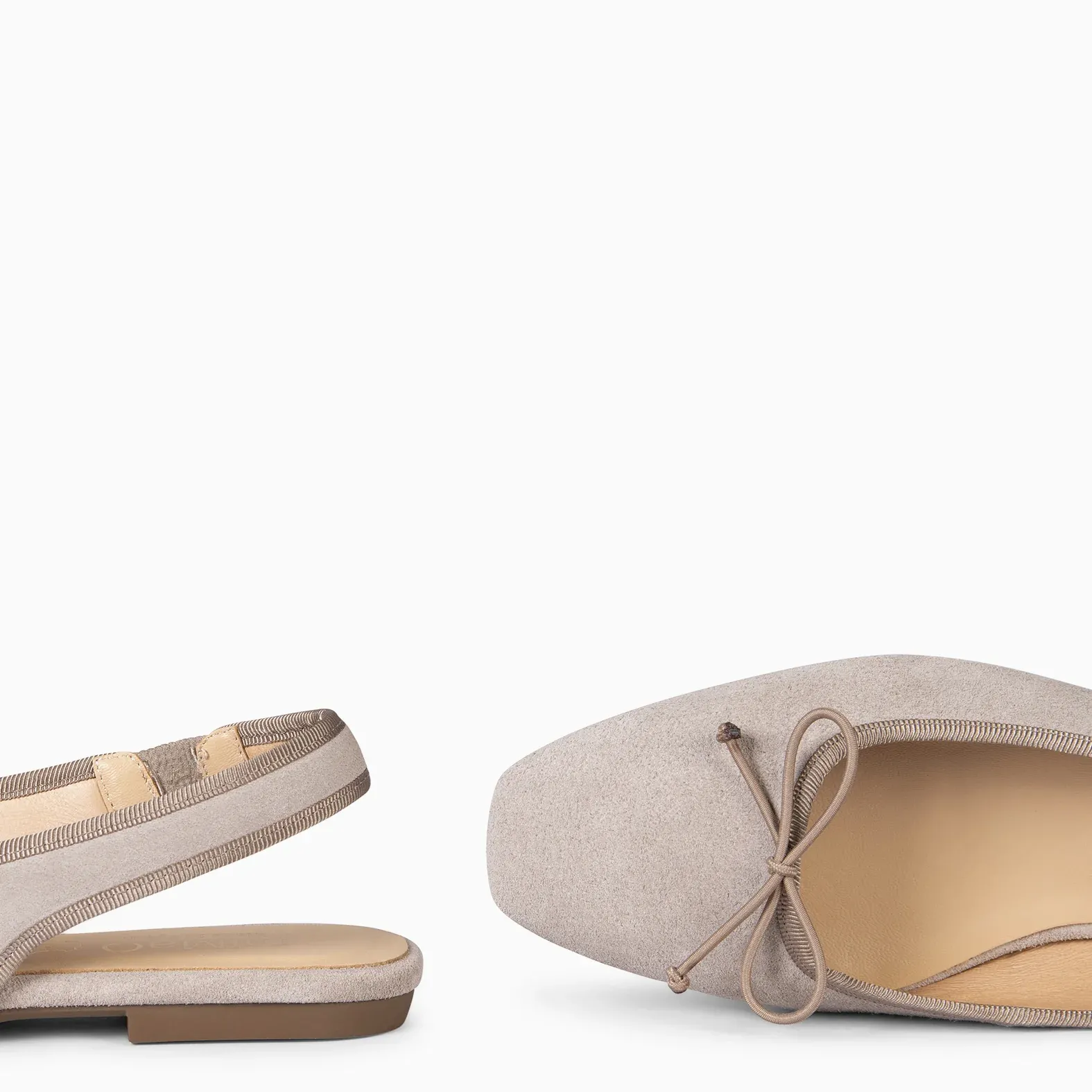 Nuestra nueva bailarina destalonada está fabricada en piel de serraje, cuenta con una altura de 1 cm. Cuenta con un espástico en la parte de atrás del pie para mejor puesta.