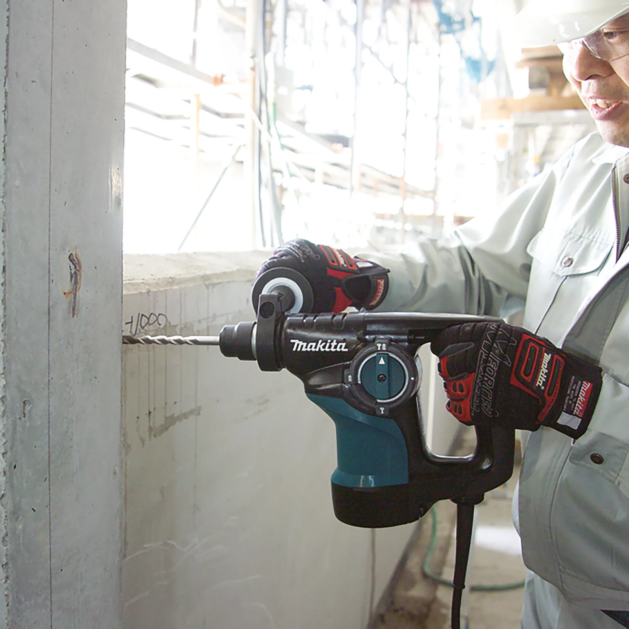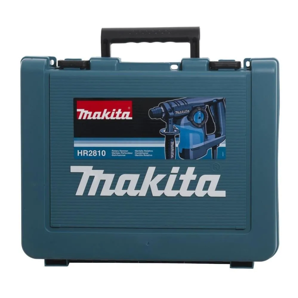 Martillo perforador con cable Makita HR2810 con una potencia de 800 W, de uso intenso, con motor de carbón potente y fiable. El diámetro de perforación en la madera es de 24 mm, en el metal es de 13 mm y en el hormigón es de 28 mm, con una fuerza de impacto de 2,9 julios y una potencia absorbida de 800 W, alcanzando una velocidad de 1100 rpm y una cantidad de golpes máxima por minuto de 4500. Su función perforadora permite obtener resultados óptimos con el mínimo esfuerzo. También dispone de una función de perforación en el hormigón, con un tipo de golpe electroneumático. El mandril es SDS Plus para una alta velocidad de trabajo con los materiales más duros. Cuenta con una función reversible y un sistema antivibración para trabajar con mayor comodidad. Tiene también una función de burilado que facilita la realización de ranuras y chaveteros en los materiales. Dispone de un embrague de seguridad. Este modelo incluye 1 empuñadura y cuenta con 3 posiciones para taladrar sin percusión, con percusión y solo picador. Cuenta con una garantía de 3 años. Longitud del cable: 2,5 m.