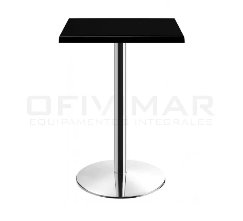 Mesa alta, compuesta por pie central de acero inoxidable acabado en brillo y tapa en madera color a elegir. Uso en interior.