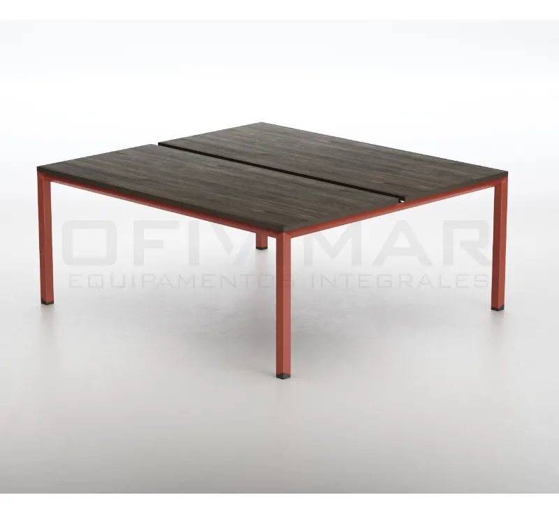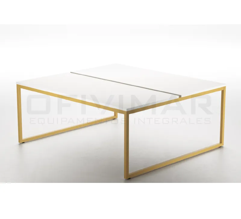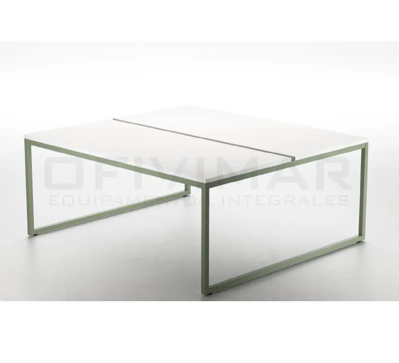 Mesa multipuesto, fabricada en estructura de acero laminado color verde y tablero bilaminado de 19 mm de espesor,acabado blanco.Niveladores con regulación en altura y unión de esquinas en aluminio inyectado.