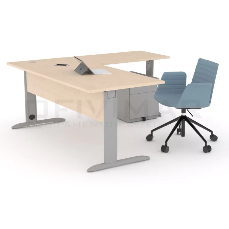 Mesa operativa, fabricada con tablero de melamina con espesor de 25 mm y cantos en ABS de 2 mm,unida a la estructura mediante tornillos. Patas metálicas,preparadas para paso de cableado y unidas entre sí mediante una viga de electrificación estructural. Provistas de taco nivelador. Con ala de 100 x 60 mm y faldón delantero. Opcionalmente se pueden instalar tapetas pasacables. Diferentes acabados y medidas (Cajonera no incluida)