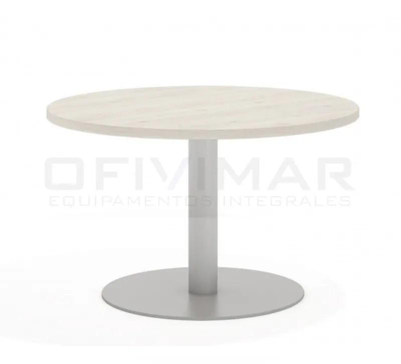 Mesa de juntas con base redonda metálica de diámetro 70mm, color gris. Encimera fabricada en tablero de aglomerado de espesor de 25 mm.Diferentes acabados a elegir.