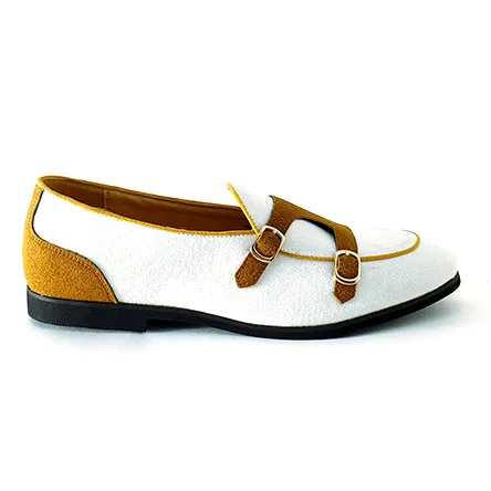 Mocasín Castillo, de nuestra marca On1 de color blanco con detalles en color camel. Además, del borde del empeine sobresalen un par de hebillas metálicas para embellecerlo. Se trata de un zapato muy elegante.