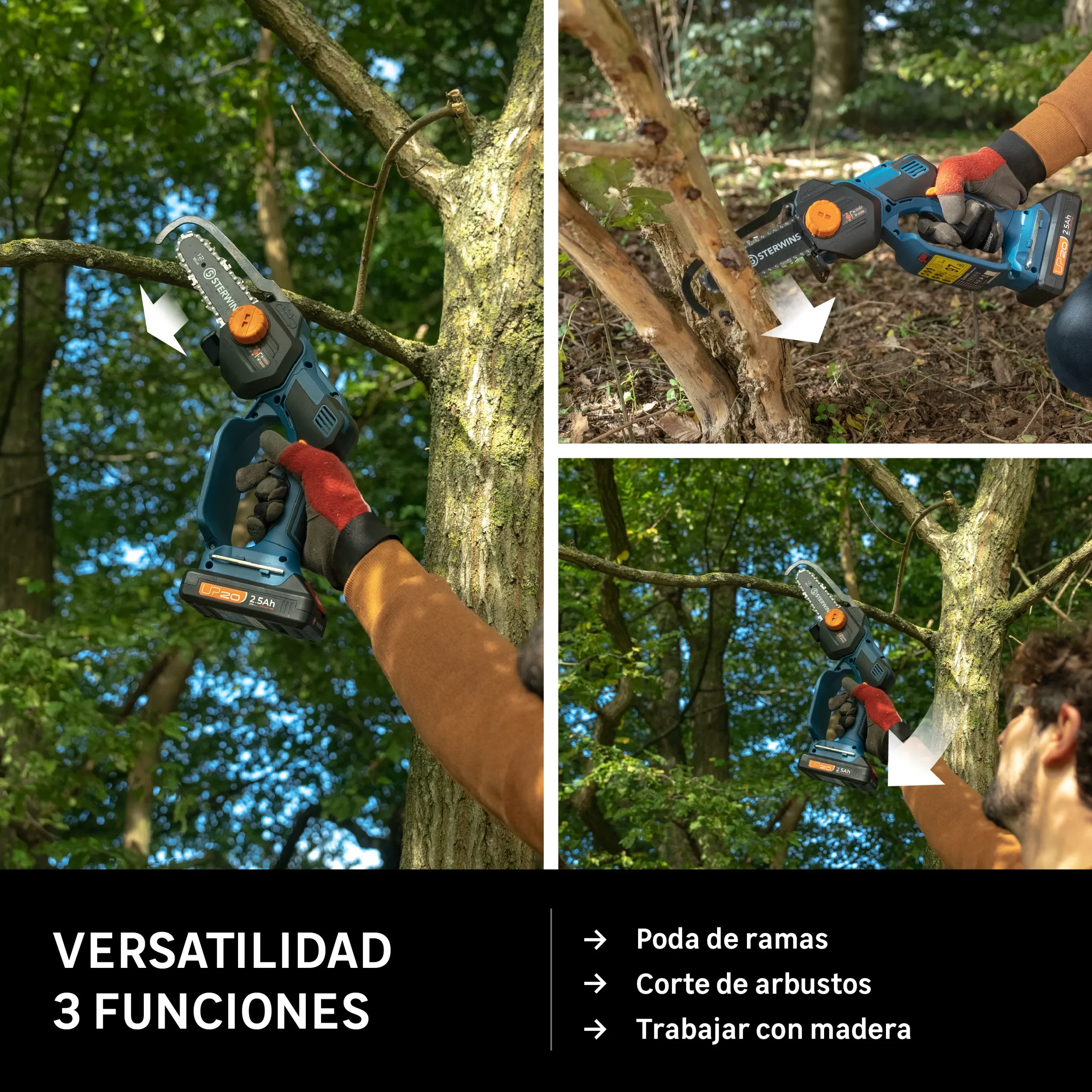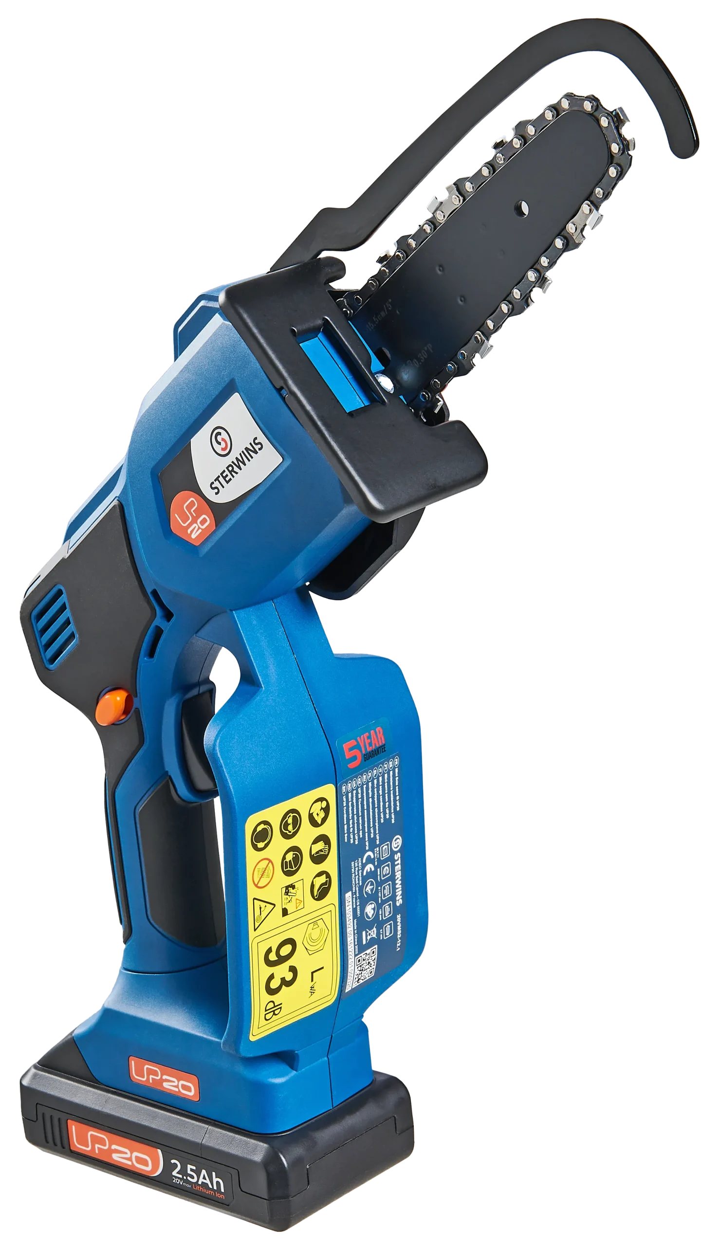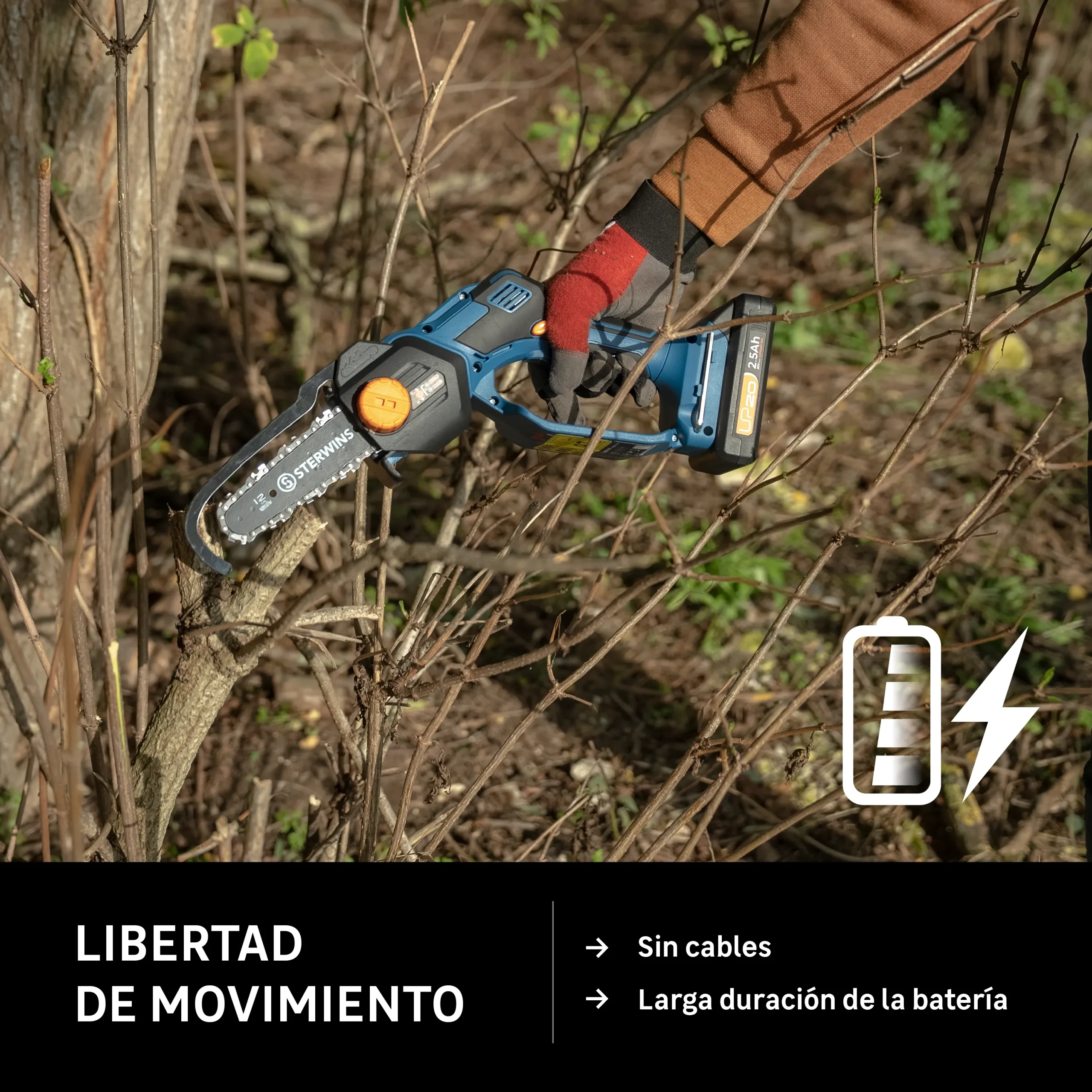 Motosierra de batería Sterwins. Gracias a sus 15,5 cm de longitud de espada, resulta la herramienta ideal para desarrollar todo tipo de tareas que requieran hacer cortes trasversales. Cuenta con indicador de carga, integración en una plataforma, sistema antivibración y batería de ion-litio. Este producto es reparable y tiene una garantía de 5 años; ponte en contacto con el servicio posventa de tu tienda para obtener más detalles. Medidas: 15,5 x 23,1 cm (longitud de guía x alto).