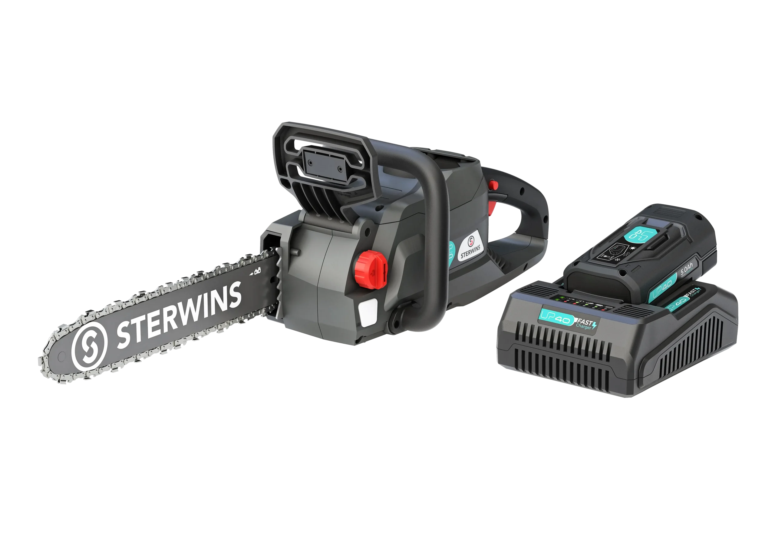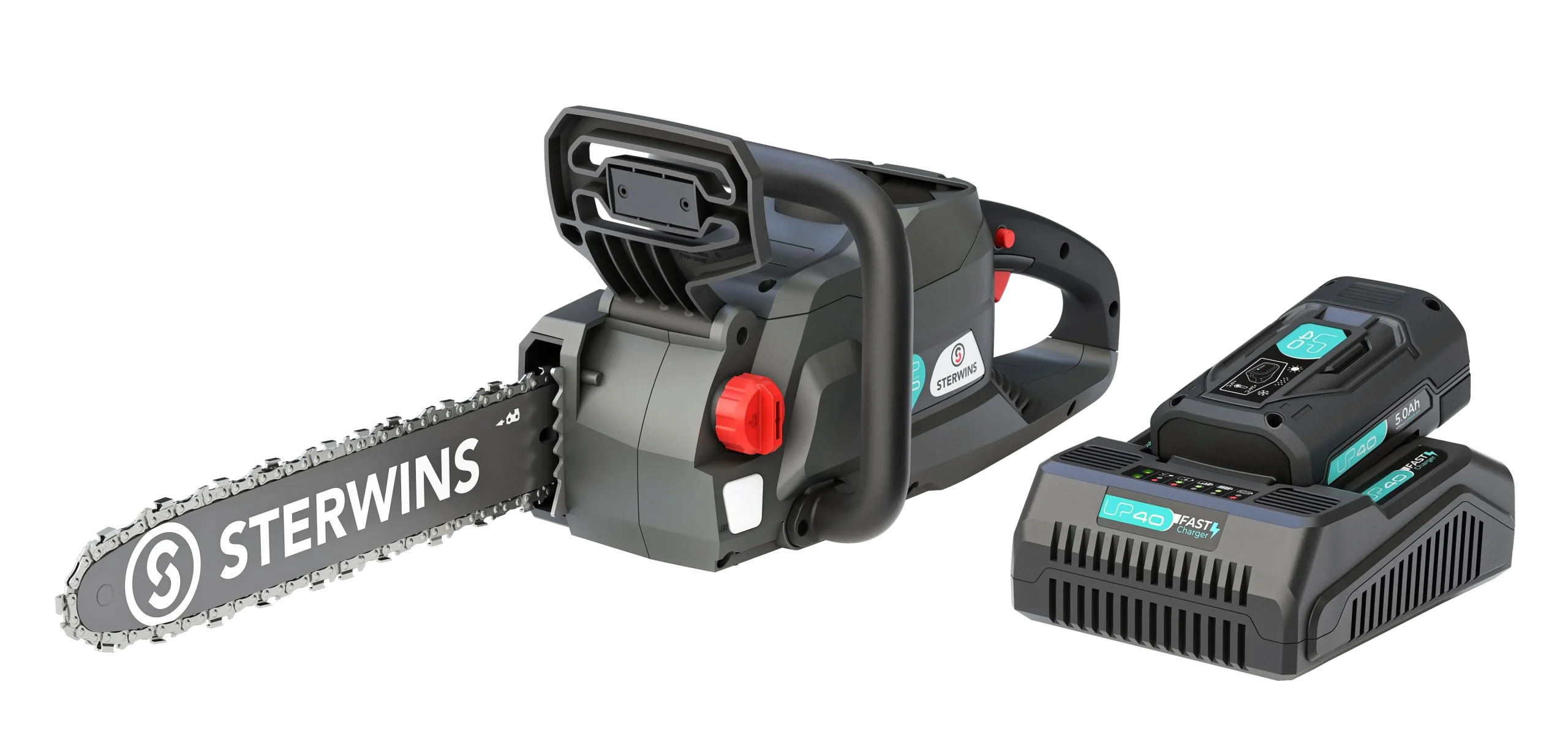 Motosierra a batería Sterwins de 40 V, 5 Ah y una espada de 35 cm de longitud. La batería tiene una autonomía de 30 minutos, lo que te permitirá trabajar cómodamente sin necesidad de depender de cables o enchufes. También cuenta con indicador de nivel de aceite, para que puedas controlarlo en todo momento. Está pensada para realizar cortes de troncos de sección media. Ofrece 3 años de garantía.