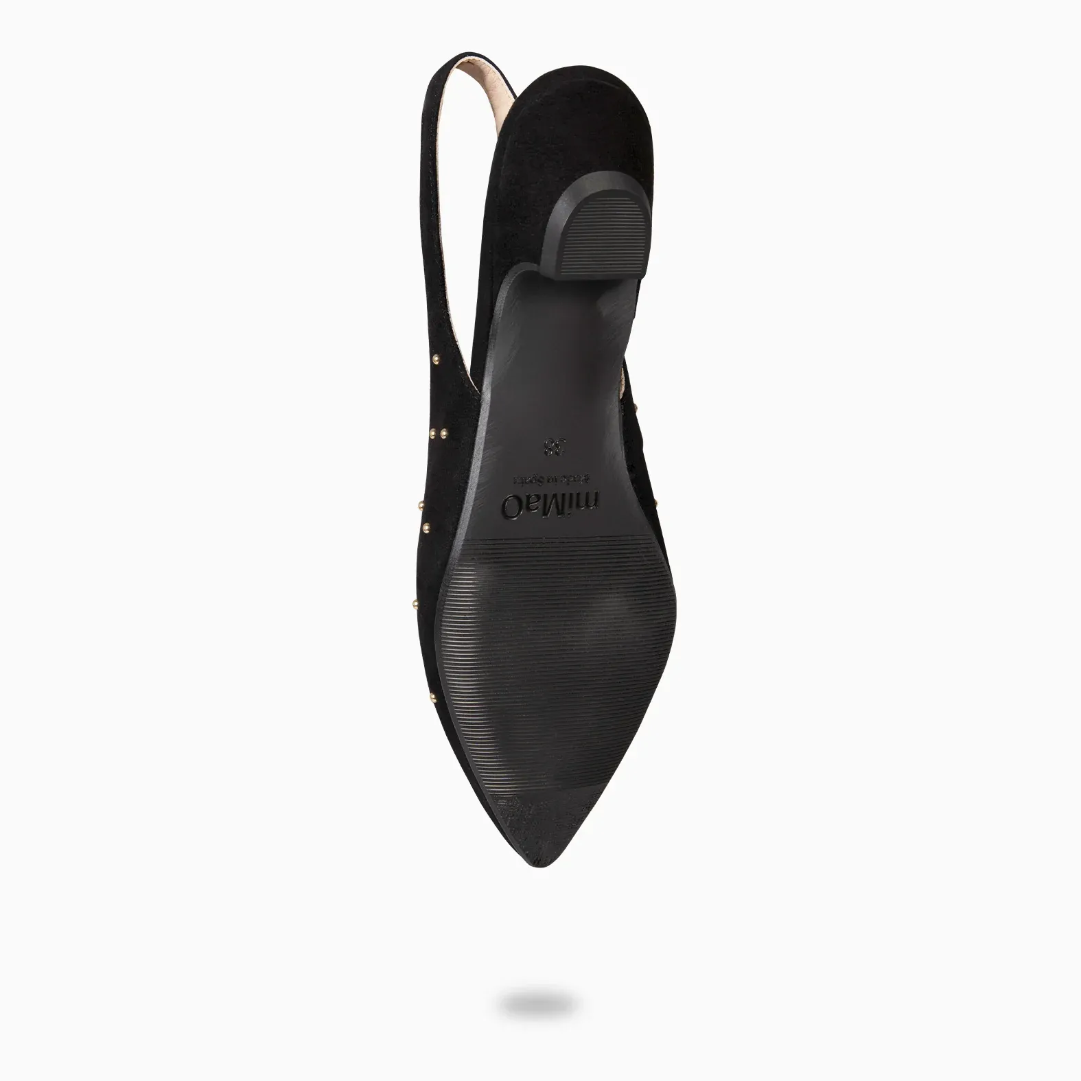 Estos zapatos destalonados están recubiertos de tachas, las cuales están recubiertas en el interior para que no haga ninguna rozadura. Son de piel de ante, cuentan con un pequeño tacón de diamante de 2cm. Además, cuenta con elástico en la parte del talón.