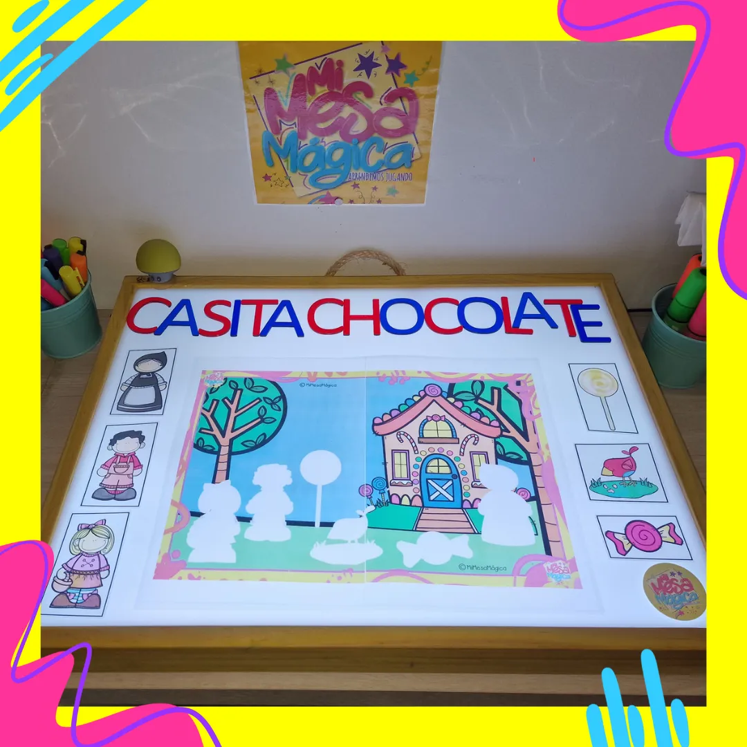6 láminas en tamaño a3 con tarjetas (Caperucita, 3 Cerditos, Aladin, Bella Durmiente, La Casita de Chocolate y Ricitos de Oro) para rellenar los huecos.