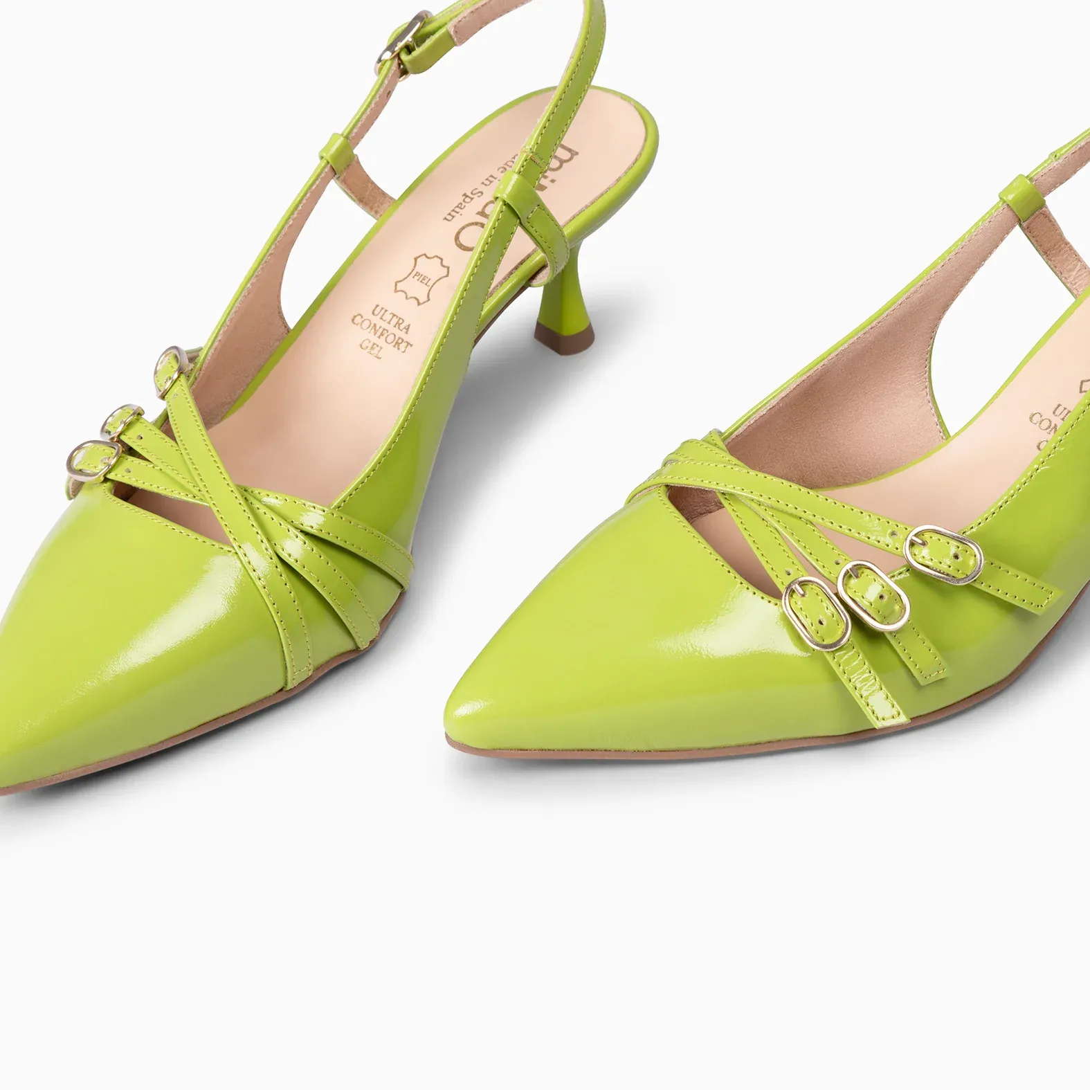 Los zapatos de tacón bajo destalonados tienen un tacón de 6 cm y están hechos en piel de charol. Presentan un elegante acabado en V, con hebillas decorativas en el empeine, y una hebilla trasera ajustable para un ajuste más cómodo y seguro.