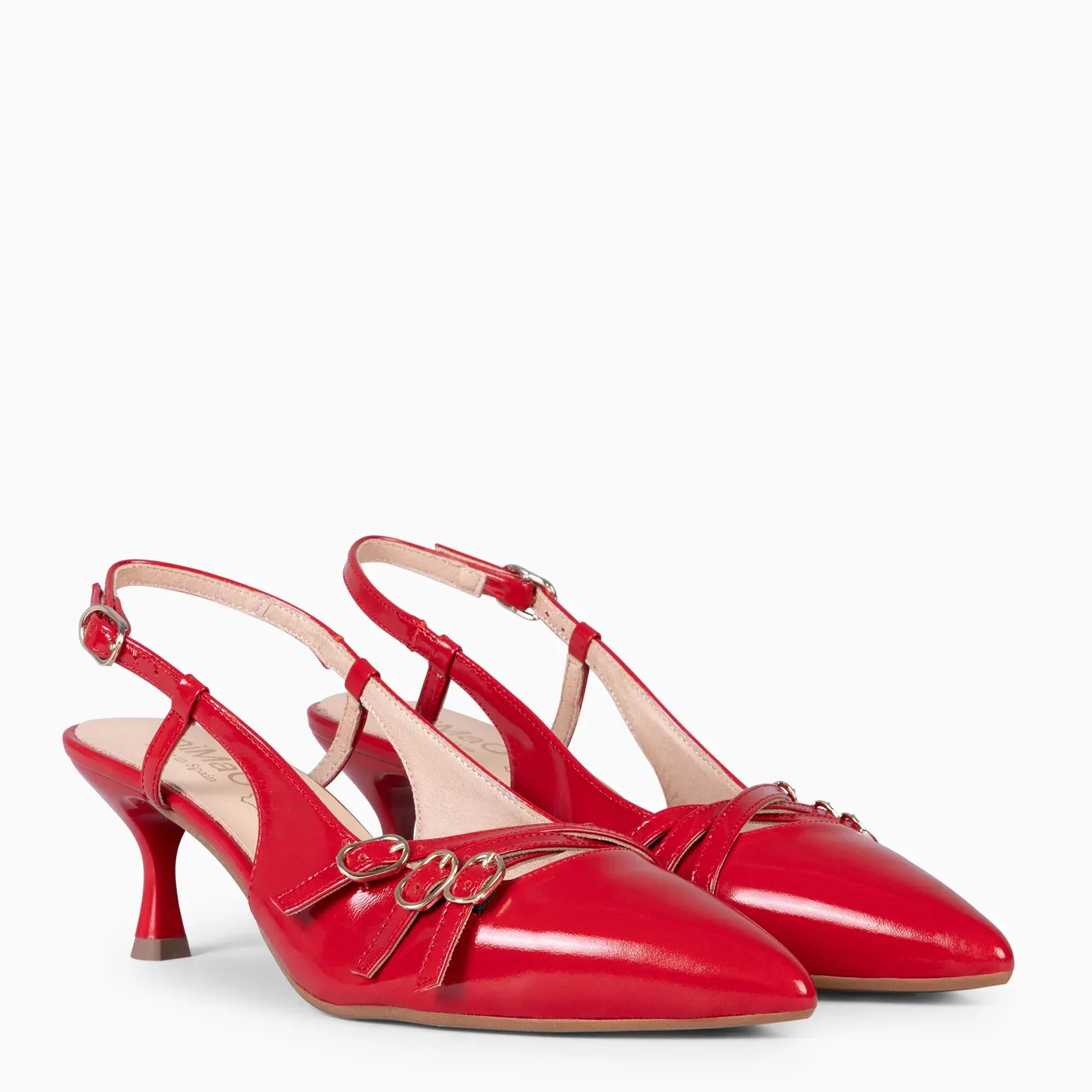 Los zapatos de tacón bajo destalonados tienen un tacón de 6 cm y están hechos en piel de charol. Presentan un elegante acabado en V, con hebillas decorativas en el empeine, y una hebilla trasera ajustable para un ajuste más cómodo y seguro.