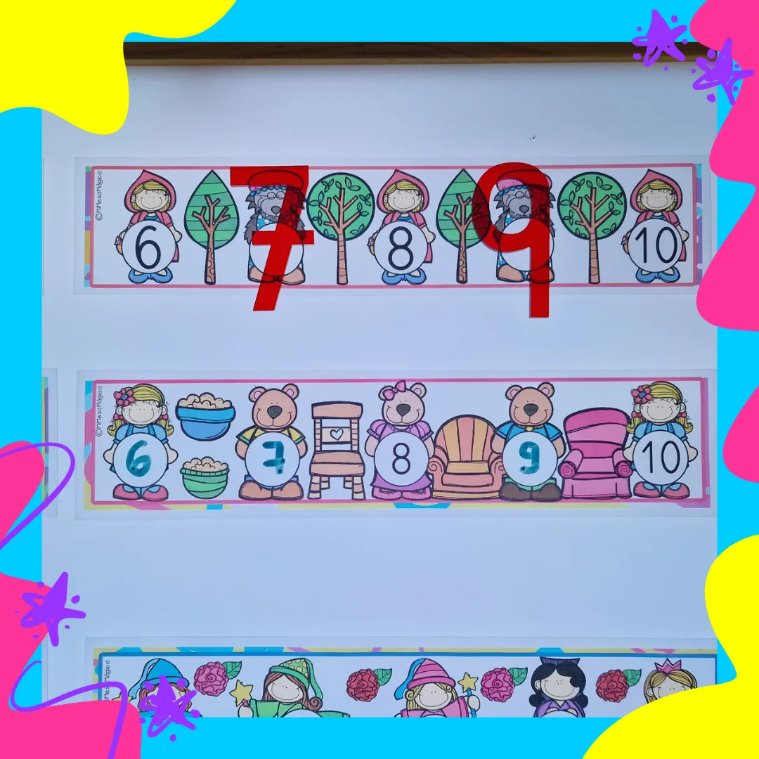 6 tiras de series de números del 1 al 10 para rellenar los huecos que faltan.