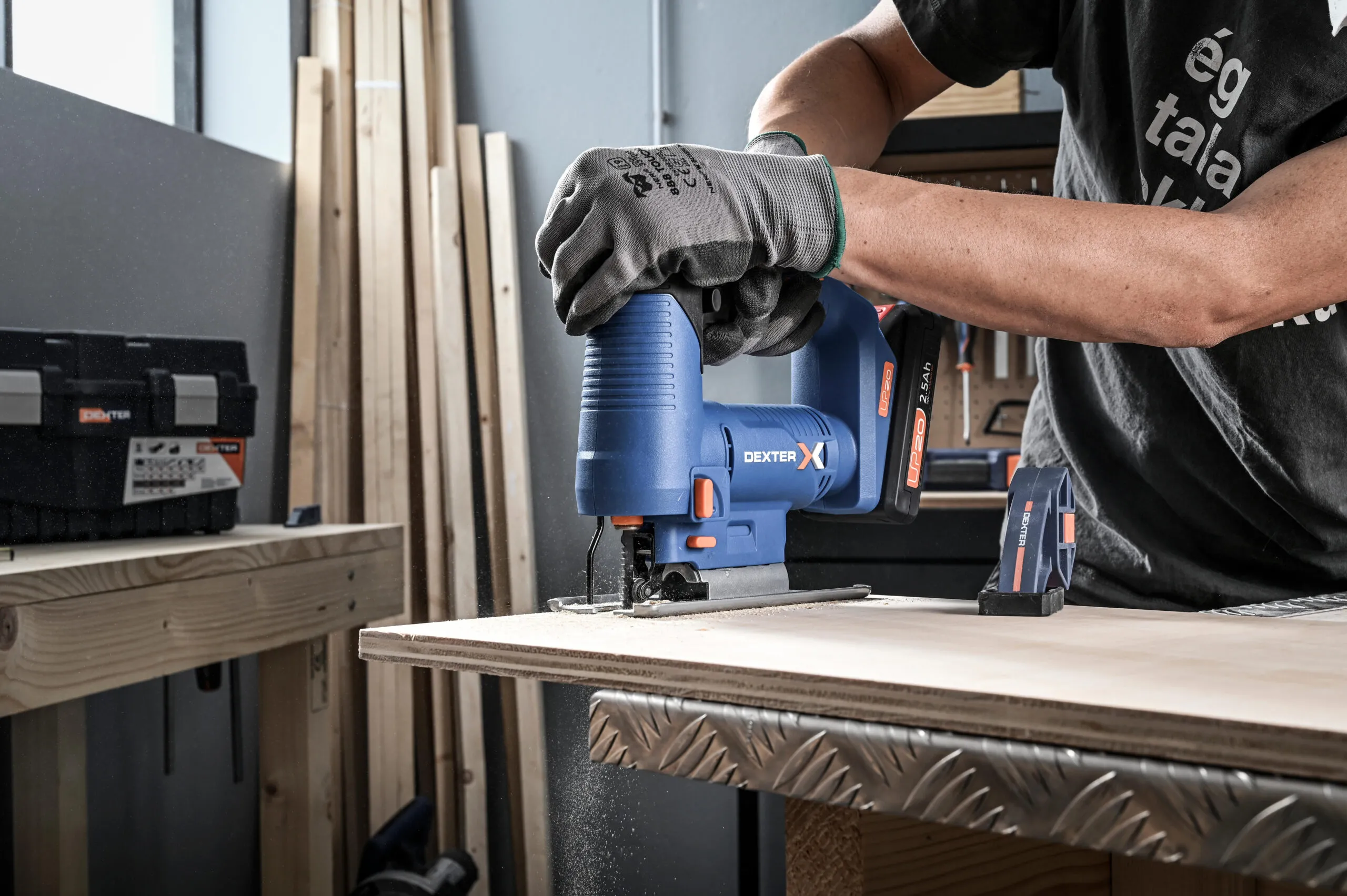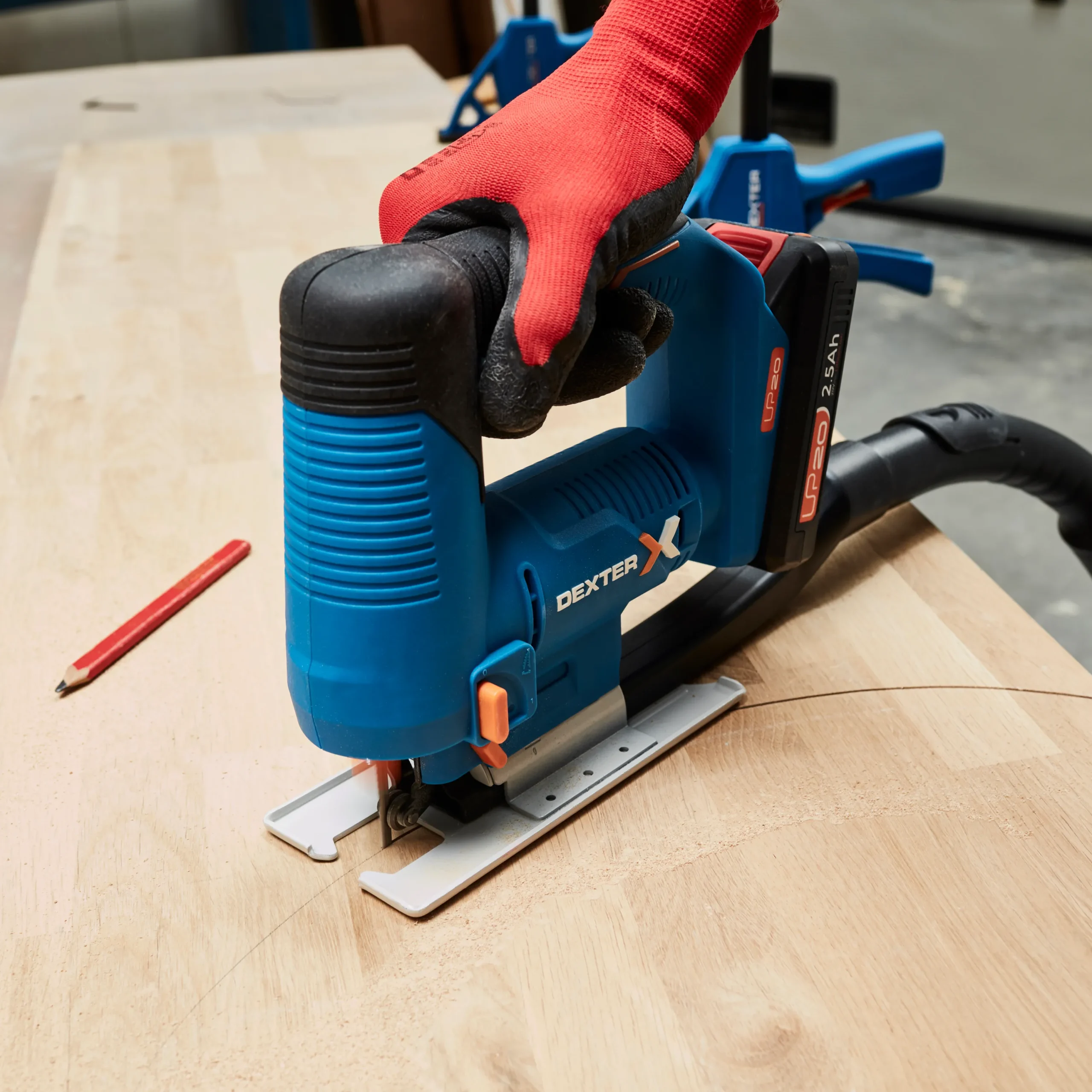 Sierra de calar sin cable Dexter de 20 V, con batería de ion-litio (no incluida). De uso doméstico ideal para cortes curvos y cortos, con un ángulo de corte de 45º. Su hoja, de acero, ofrece una capacidad de corte de 80 mm en la madera a 90º, 6 mm en el acero y 6 mm en el metal a 90º. El recorrido de la hoja es de 23 mm, con una altura del recorrido de 23 mm. El sistema de fijación de la hoja de sierra es rápido, lo que permite un fácil y cómodo cambio de la hoja sin necesidad de herramientas adicionales. El sistema de sujeción de la hoja es con encastre en T. El movimiento de la hoja es pendular, con 2 posiciones. La plataforma está fabricada en metal y cuenta con una empuñadura ergonómica para un uso más cómodo. Dispone de un botón de ventilación e incorpora iluminación integrada para facilitar el trabajo en lugares oscuros o con poca iluminación. Cuenta con sistema antivibración y dispone de un control de velocidad variable que permite adaptar la velocidad en función del material que estemos cortando. Cuenta con una garantía de 3 años. Medidas: 8 x 20,3 x 22 cm (ancho x alto x fondo).