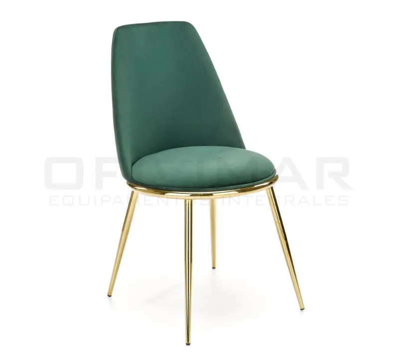 La silla con estructura metálica cromada dorada y asiento tapizado en terciopelo es una pieza que combina elegancia y sofisticación, ideal para ambientes que buscan un toque de distinción. Sus características principales son: