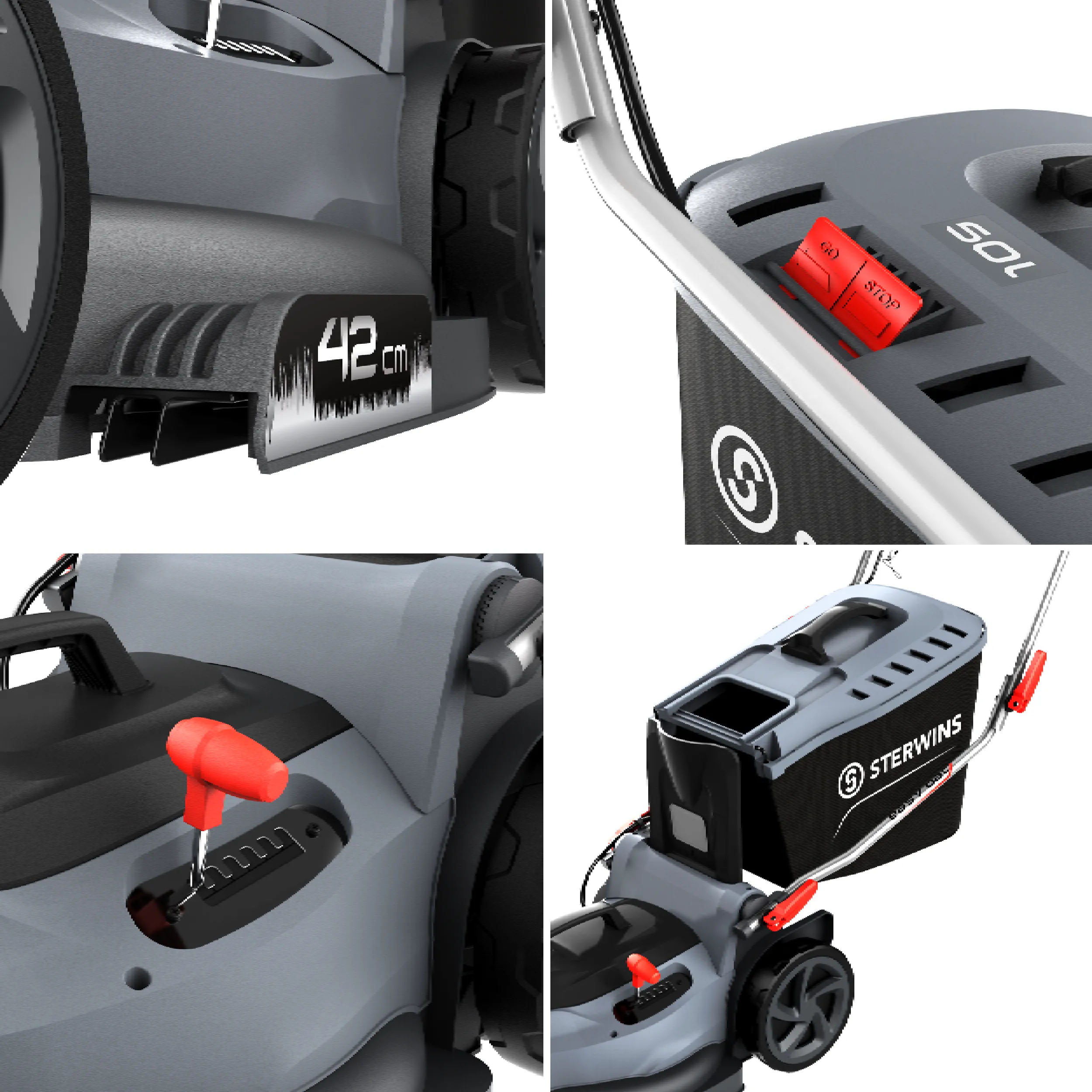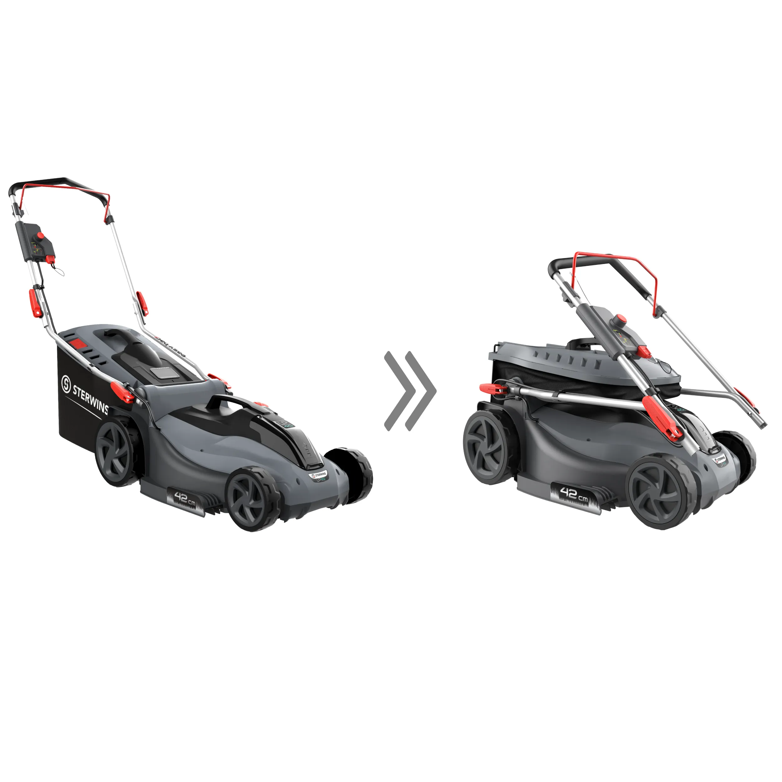 STERWINS – Cortacésped de batería – 800W – Batería 40V – Cargador UP40 – Ancho de corte 42 cm – Altura de corte de 2,5 a 7,5 cm – Caja recolectora 50