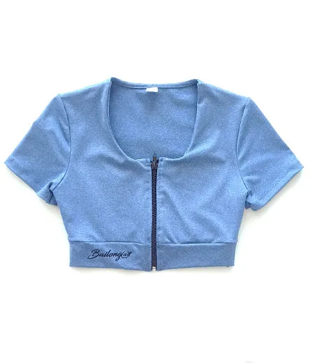 Os presentamos el Top Cremallera Mezclilla. Es un top de la línea básica de manga corta pero con la diferencia de que se cierra mediante una pequeña cremallera en el centro de la camiseta. Disponible en 3 tonos diferentes a elegir: frambuesa, verde y azul. Incorpora nuestro logo Bailong@s es la parte inferior, sobre la cintura. Modelo muy favorecedor.