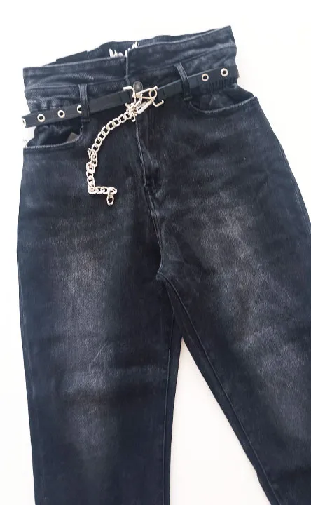 Os presentamos nuestro Vaquero Negro Cinturón Mona. Es un pantalón de corte vaquero y de corte recto. Incorpora 5 bolsillos. 3 de ellos en la parte delantera y 2 más en la parte trasera. Tiene también trabillas donde va el cinturón que podrás poner o quitar a tu gusto.