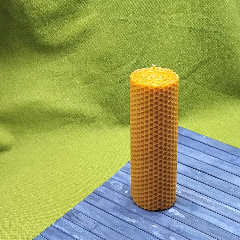 El proceso de elaboración de las velas de cera de abeja es artesanal, enrollando las planchas de cera de abeja virgen y permitiendo un prendido más efectivo y duradero. Para su acabado en color se utiliza una base de tinte sin aditivos químicos, manteniendo su carácter genuino y natural. El resultado es una bonita combinación entre el color y la característica textura de panal de abeja de la cera.