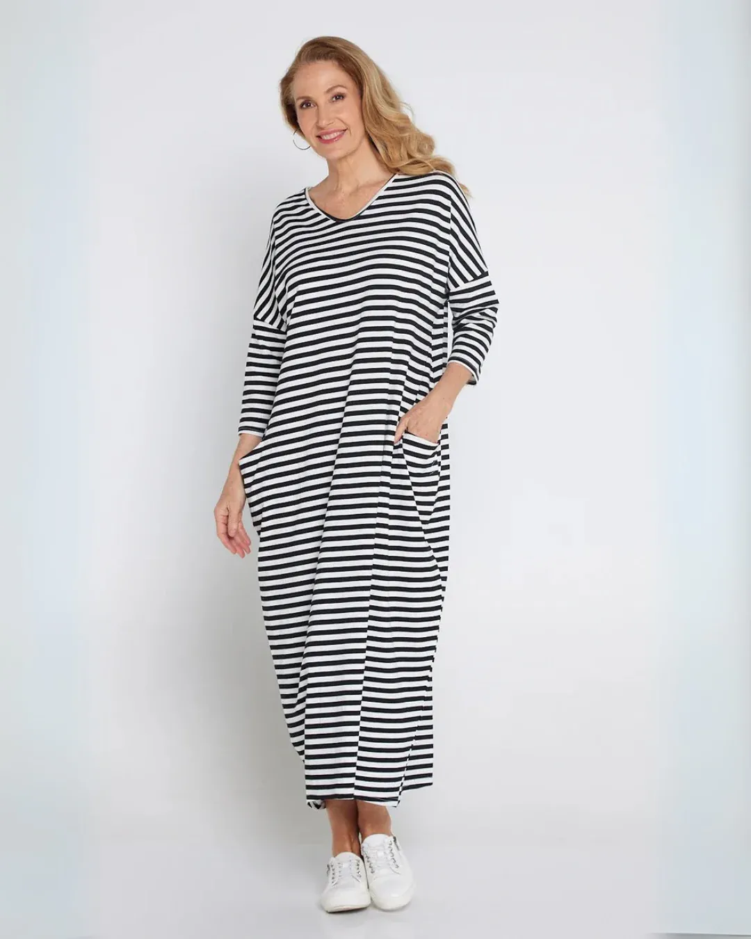 Combina la clásica elegancia de las rayas con un diseño práctico y actual. Su corte recto y cuello en V lo hacen ideal para todo tipo de ocasiones informales. Los bolsillos aportan un toque funcional chic. Llévalo con zapatillas o sandalias y estarás lista.