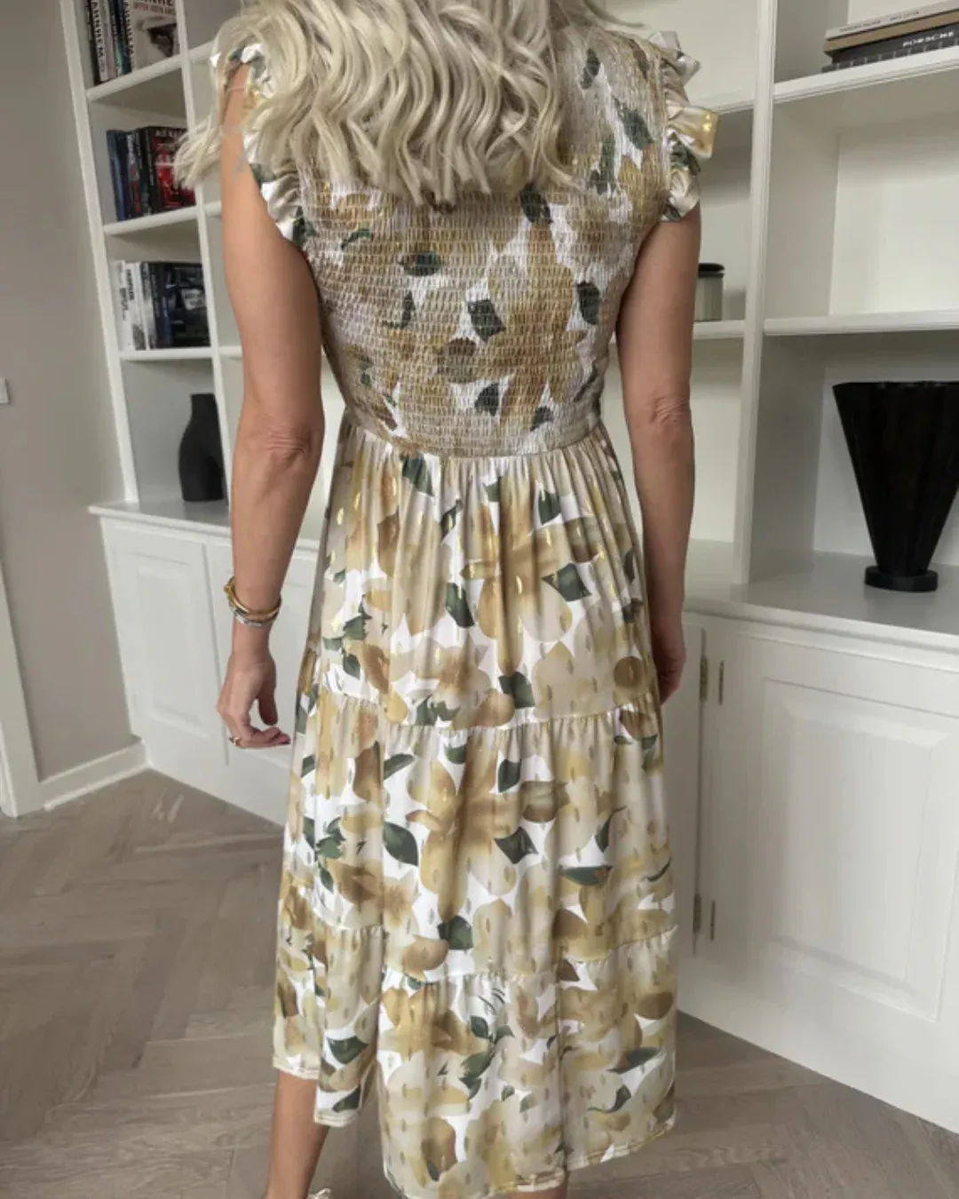 Este vestido floral destaca por su diseño romántico y lleno de vida. El fruncido en el pecho realza la figura de manera natural y favorecedora. Su tejido ligero y suave garantiza comodidad en todo momento. Perfecto para días soleados y ocasiones especiales.