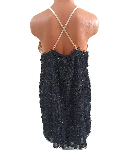 Os presentamos nuestro Vestido Plumas. Precioso vestido confeccionado en dos tejido: con un suave tejido de color negro, con pequeñas plumitas combinadas con brillos para la parte inferior de la falda ligeramente acampanada; combinado con la parte superior en forma de top de escote pico y finos tirantes que completa el conjunto con lentejuelas doradas. Falda ligeramente acampanada y por encima de la rodilla, de estilo divertido y desenfadado. Las copas están preformadas para que no necesites llevar sujetador y podrás acomodar la longitud de los tirantes a tu busto ya que son regulables también.