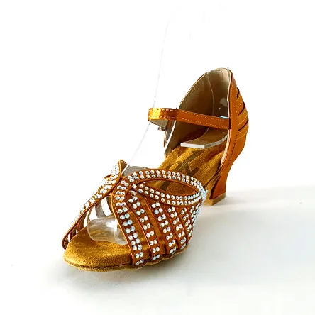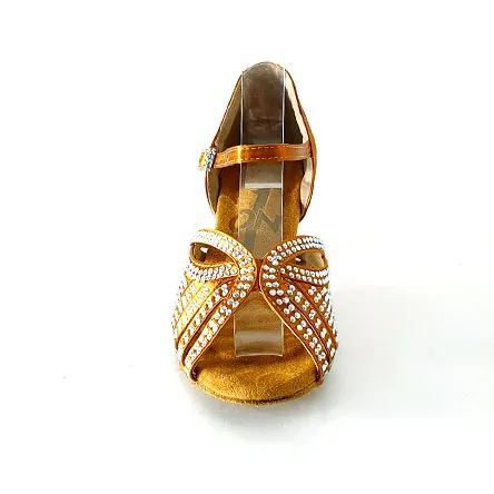 Zapato de baile Melanie, de nuestra marca On1 de color camel con piedras brillantes para embellecerlo. Almohadilla interna extra para mayor confort al bailar. Tacón de 5 cm cubano.