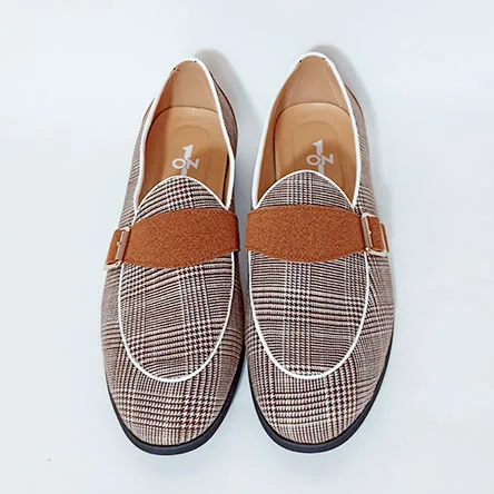 Zapatos Tartan Marrón, es un zapato de nuestra marca On1. Fabricado en su exterior en tela y detalles en ante. Lleva un diseño con la tela con tejido de diseño de cuadros de estilo tartan en tono marrón, que acaba con un detalle de ante en el talón así como en la parte del empeine donde lleva una pequeña hebilla decorativa, así como una pequeña costura blanca. También posee un pequeño tacón para mayor comidad.